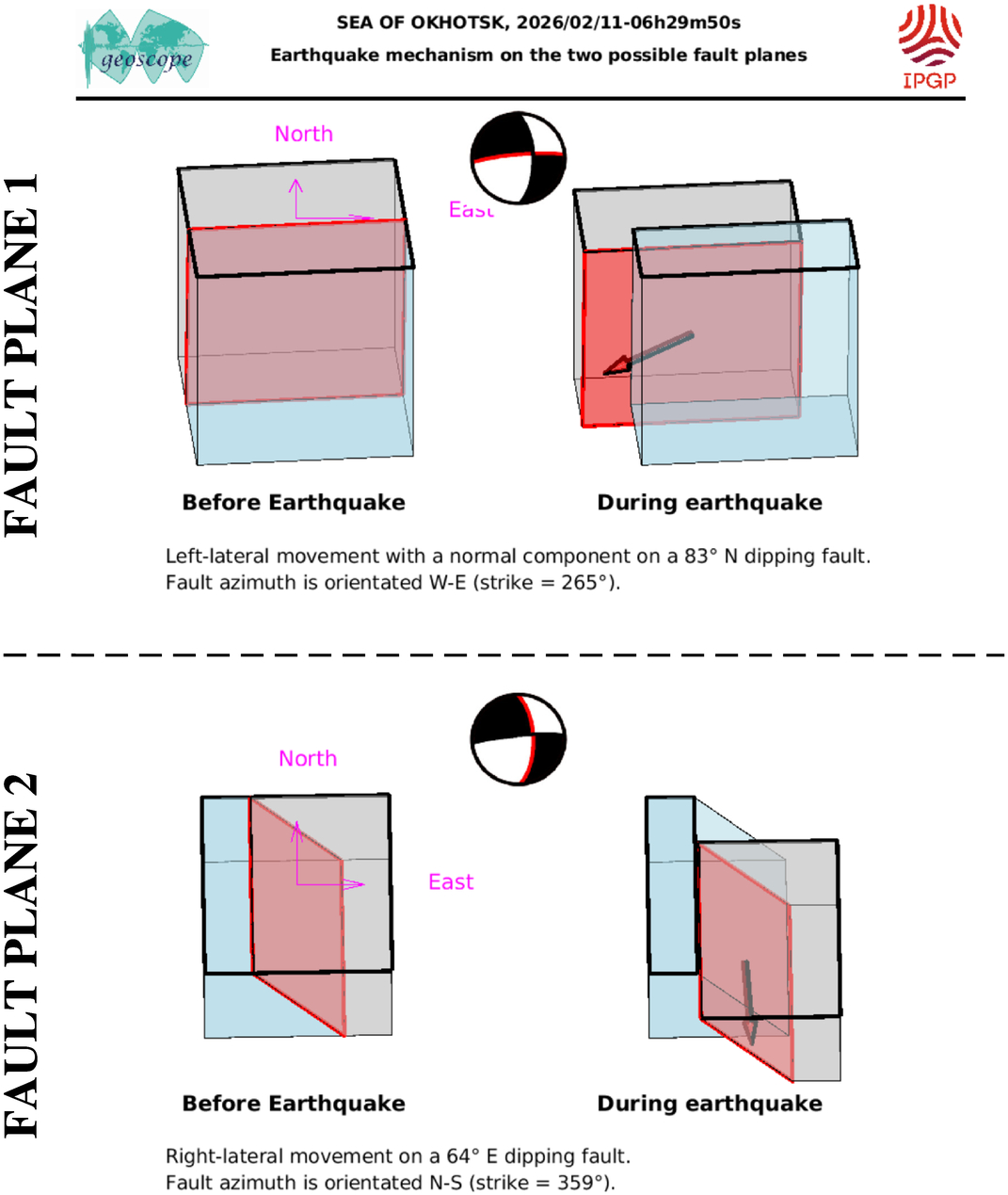 This figure illustrates how the two blocks separated by the seismic fault are displaced during the earthquake. These movements are deduced from the SCARDEC focal mechanism, on the two possible fault planes. Additional information (tectonics, near-fault measurements) is required to determine which one of these two hypotheses corresponds to the real movements during the earthquake.