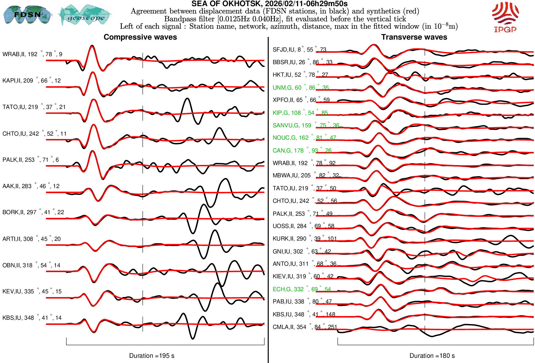 The SCARDEC solution is used here to predict the waveforms at all Geoscope stations received in real time and located at distances between 30° and 150° from the earthquake. All available location codes are used, for the BH* channels. In the range [30° - ~90°], the prediction is done on P and S(H) waves and in the range [~90° - 150°], it is done on PP and SS(H) waves. See agreement for P or PP waves (vertical components) between data and synthetics in Figure 1; see agreement for S(H) or SS(H) waves (horizontal components) between data (black) and synthetics (red) in Figure 2. Tables 1 and 2 provide quantitative estimates of these agreements.