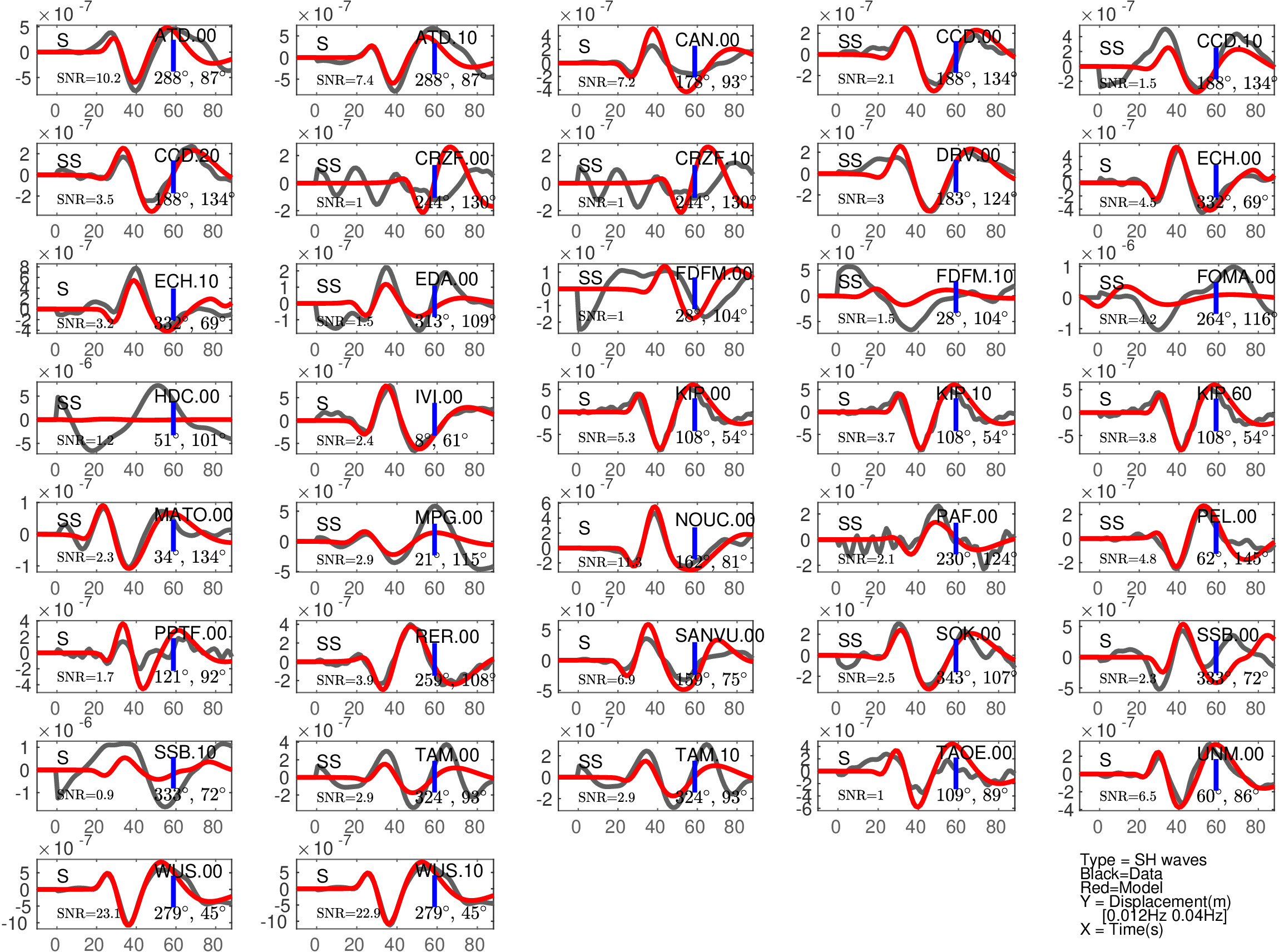 Figure 2: Same as Figure 1, but for S(H) or SS(H) waves (use of the rotated horizontal component along the transverse direction). See in Table 2 the quantitative estimates ('Dt1' and 'Fit1') corresponding to this Figure.