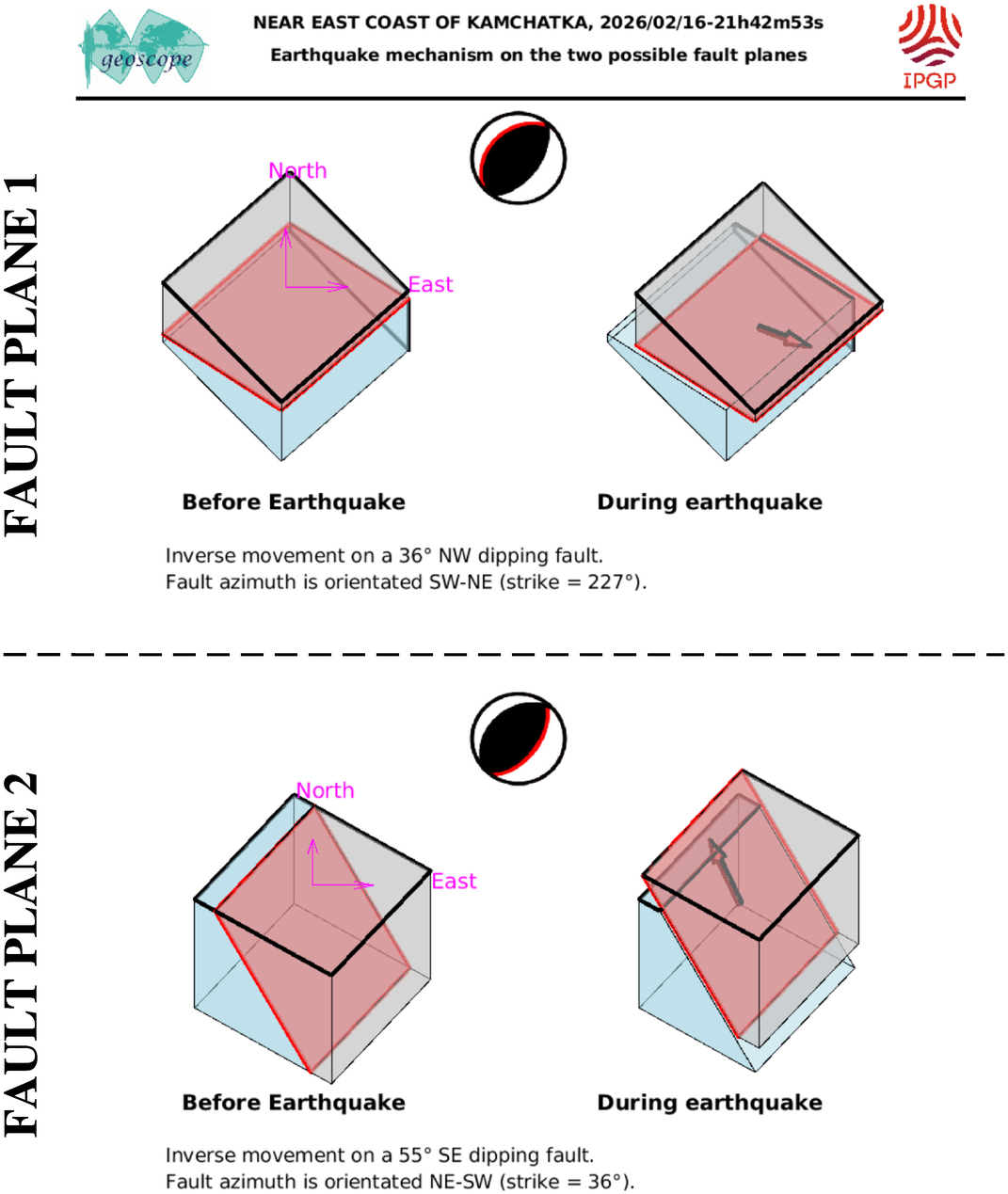 This figure illustrates how the two blocks separated by the seismic fault are displaced during the earthquake. These movements are deduced from the SCARDEC focal mechanism, on the two possible fault planes. Additional information (tectonics, near-fault measurements) is required to determine which one of these two hypotheses corresponds to the real movements during the earthquake.