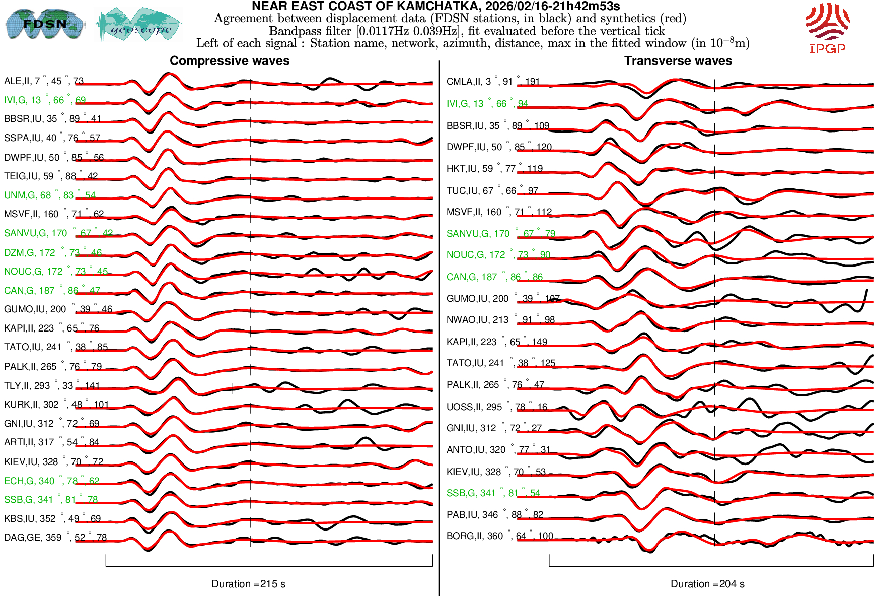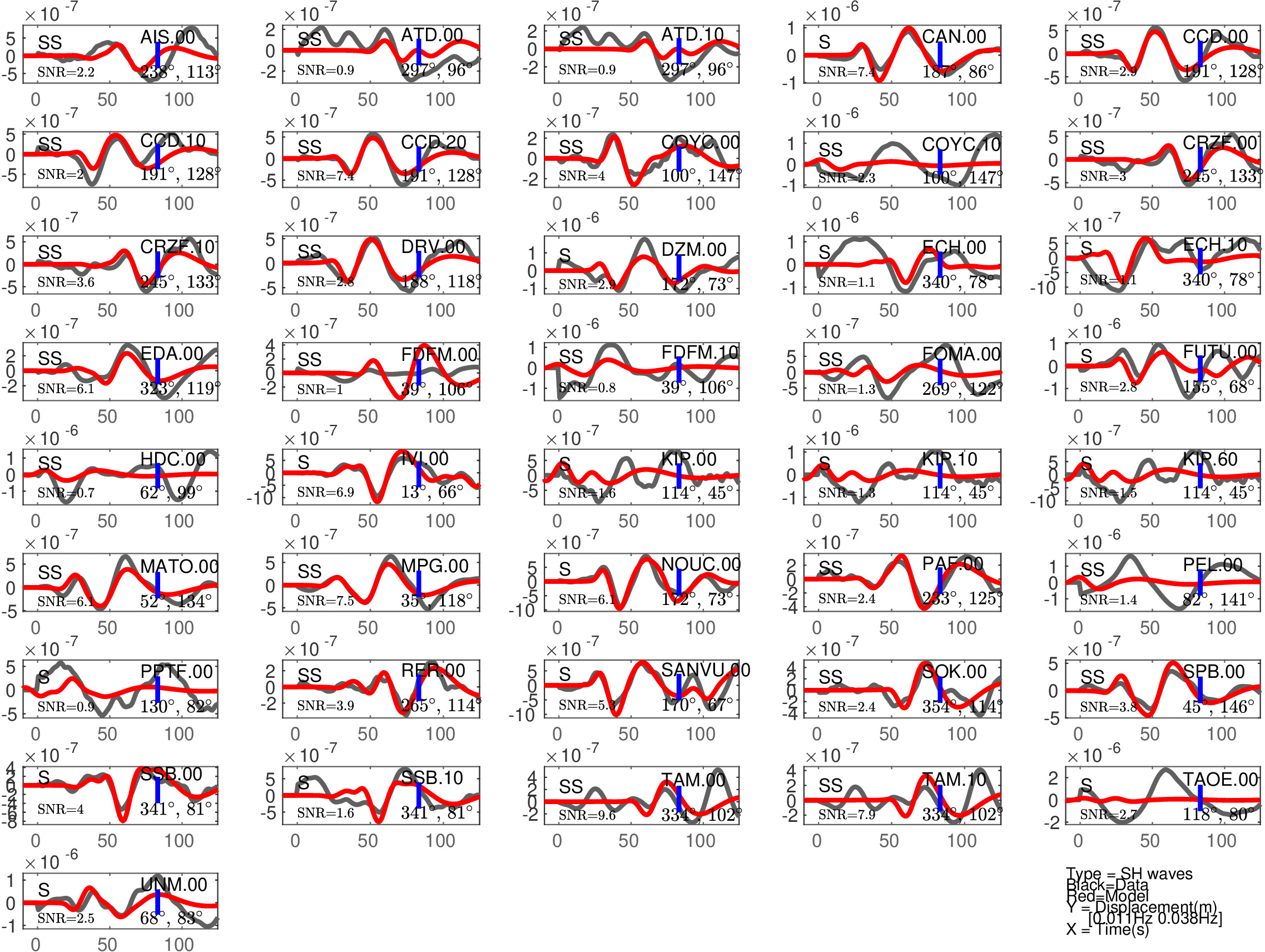 The SCARDEC solution is used here to predict the waveforms at all Geoscope stations received in real time and located at distances between 30° and 150° from the earthquake. All available location codes are used, for the BH* channels. In the range [30° - ~90°], the prediction is done on P and S(H) waves and in the range [~90° - 150°], it is done on PP and SS(H) waves. See agreement for P or PP waves (vertical components) between data and synthetics in Figure 1; see agreement for S(H) or SS(H) waves (horizontal components) between data (black) and synthetics (red) in Figure 2. Tables 1 and 2 provide quantitative estimates of these agreements.