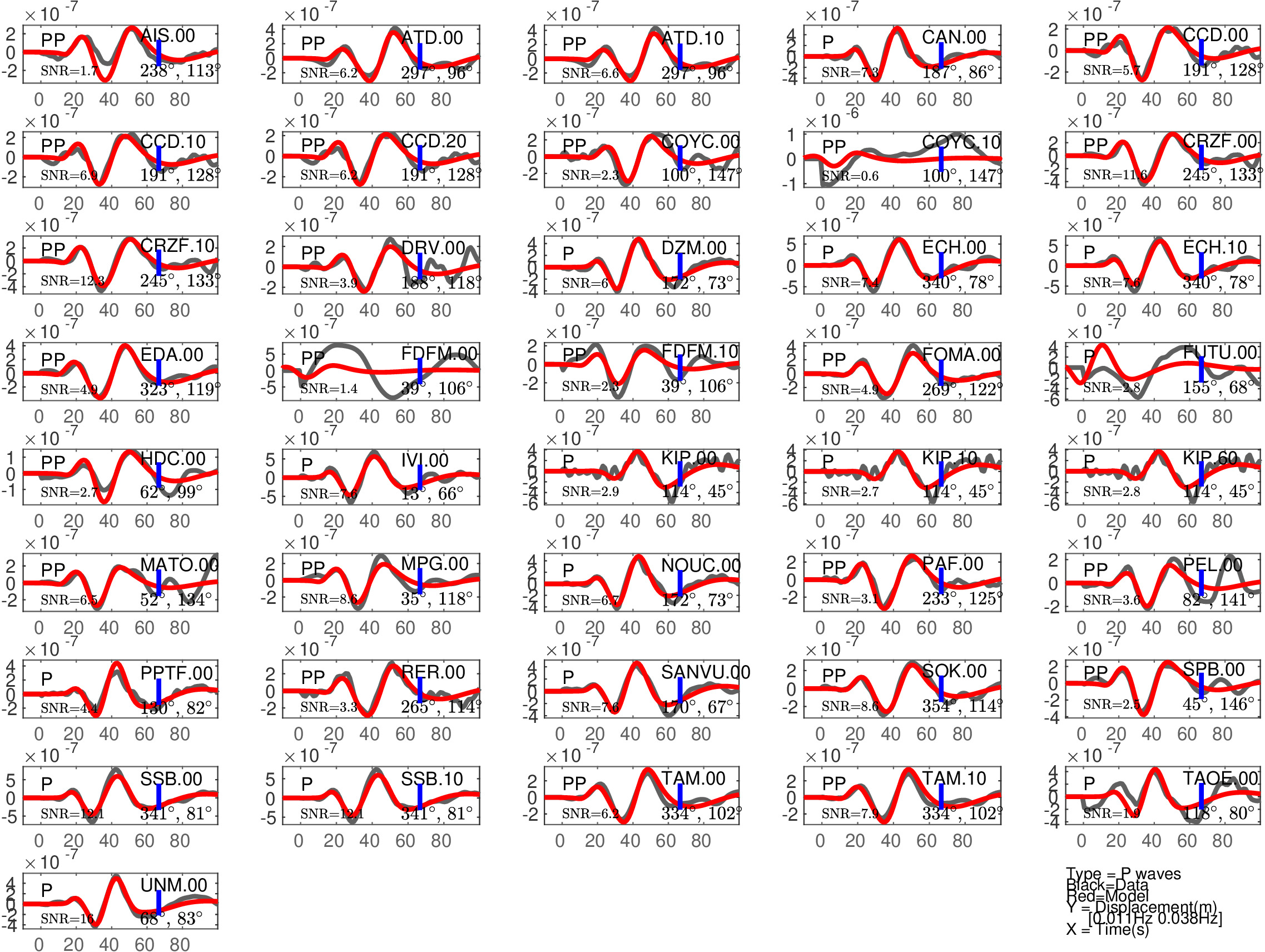 Figure 1: Agreement between data (black) and synthetics (red) for P or PP waves (the type of waves used is indicated in each subfigure). The comparison is shown with a time shift (noted 'Dt1' in Table 1), corresponding to the optimal fit ('Fit1' in Table 1) before the blue tick. Also indicated are the azimuth and distance of the station, and the signal to noise ratio (SNR). Note that the prediction done for PP waves is expected to be less accurate than the one for P waves.