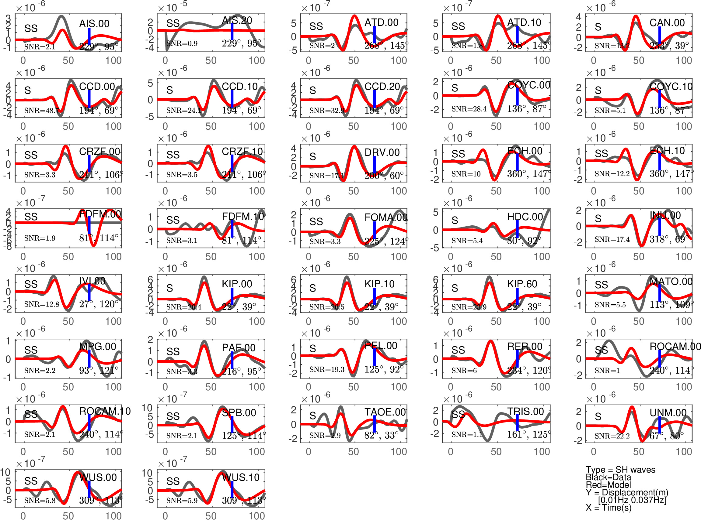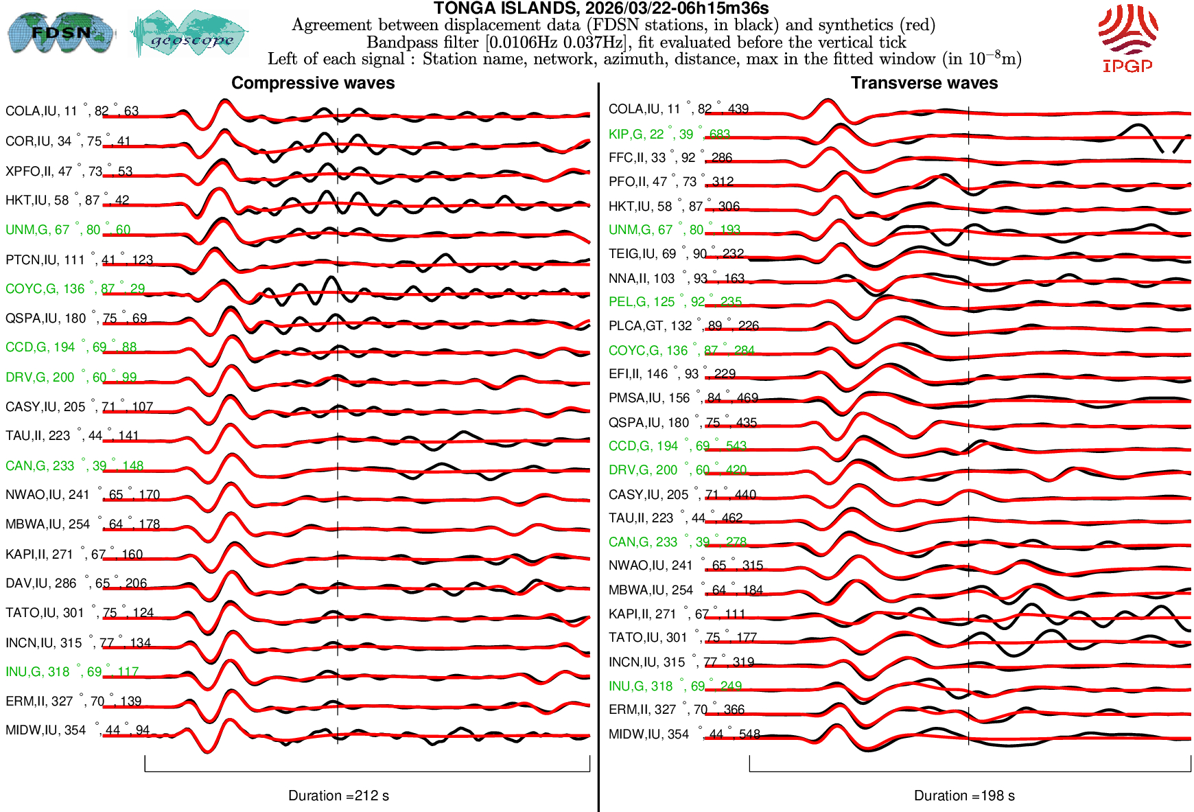 The SCARDEC solution is used here to predict the waveforms at all Geoscope stations received in real time and located at distances between 30° and 150° from the earthquake. All available location codes are used, for the BH* channels. In the range [30° - ~90°], the prediction is done on P and S(H) waves and in the range [~90° - 150°], it is done on PP and SS(H) waves. See agreement for P or PP waves (vertical components) between data and synthetics in Figure 1; see agreement for S(H) or SS(H) waves (horizontal components) between data (black) and synthetics (red) in Figure 2. Tables 1 and 2 provide quantitative estimates of these agreements.