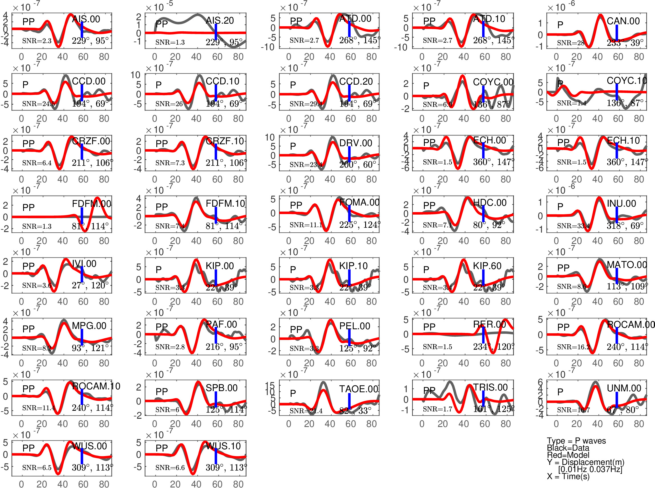 Figure 1: Agreement between data (black) and synthetics (red) for P or PP waves (the type of waves used is indicated in each subfigure). The comparison is shown with a time shift (noted 'Dt1' in Table 1), corresponding to the optimal fit ('Fit1' in Table 1) before the blue tick. Also indicated are the azimuth and distance of the station, and the signal to noise ratio (SNR). Note that the prediction done for PP waves is expected to be less accurate than the one for P waves.