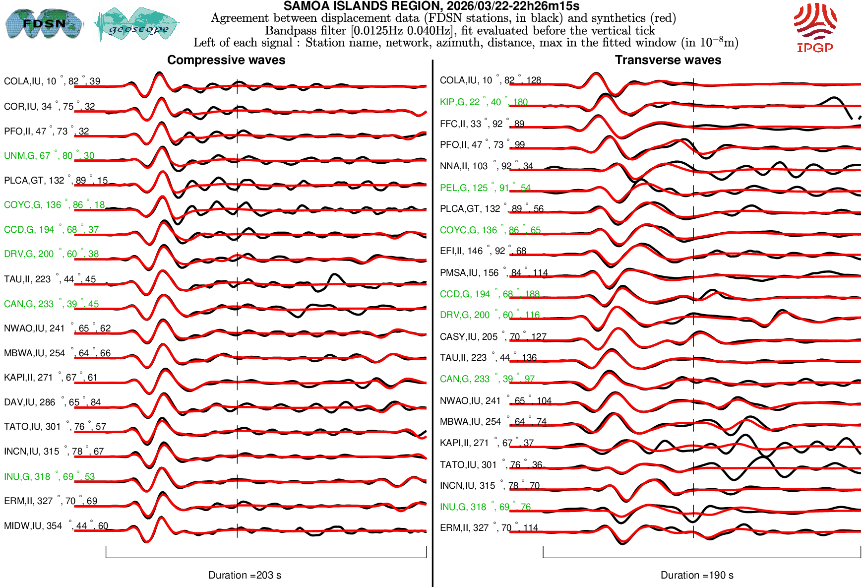 The SCARDEC solution is used here to predict the waveforms at all Geoscope stations received in real time and located at distances between 30° and 150° from the earthquake. All available location codes are used, for the BH* channels. In the range [30° - ~90°], the prediction is done on P and S(H) waves and in the range [~90° - 150°], it is done on PP and SS(H) waves. See agreement for P or PP waves (vertical components) between data and synthetics in Figure 1; see agreement for S(H) or SS(H) waves (horizontal components) between data (black) and synthetics (red) in Figure 2. Tables 1 and 2 provide quantitative estimates of these agreements.