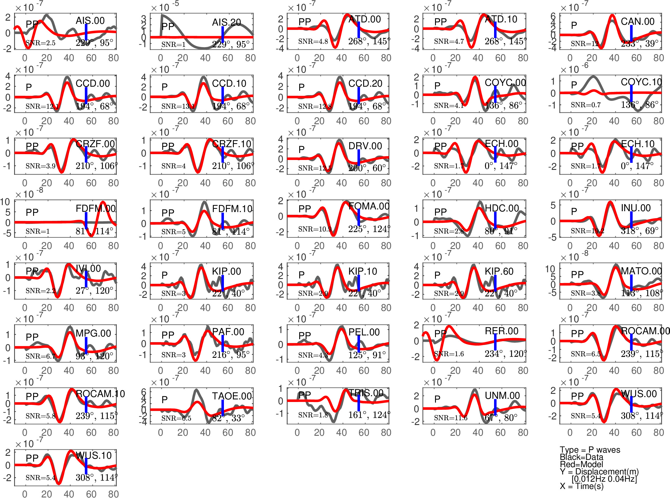 Figure 1: Agreement between data (black) and synthetics (red) for P or PP waves (the type of waves used is indicated in each subfigure). The comparison is shown with a time shift (noted 'Dt1' in Table 1), corresponding to the optimal fit ('Fit1' in Table 1) before the blue tick. Also indicated are the azimuth and distance of the station, and the signal to noise ratio (SNR). Note that the prediction done for PP waves is expected to be less accurate than the one for P waves.