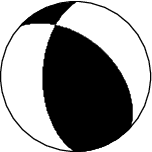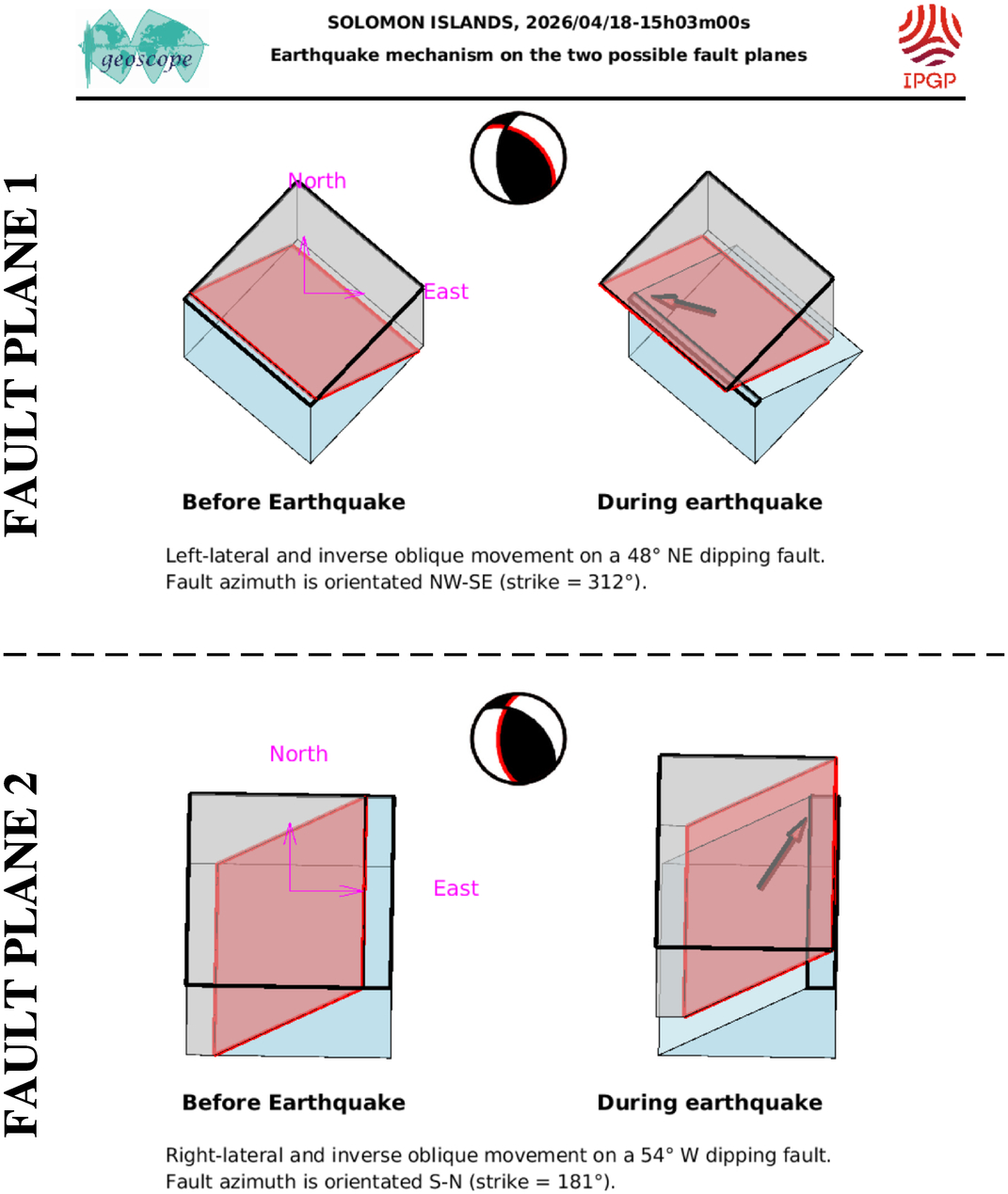 This figure illustrates how the two blocks separated by the seismic fault are displaced during the earthquake. These movements are deduced from the SCARDEC focal mechanism, on the two possible fault planes. Additional information (tectonics, near-fault measurements) is required to determine which one of these two hypotheses corresponds to the real movements during the earthquake.