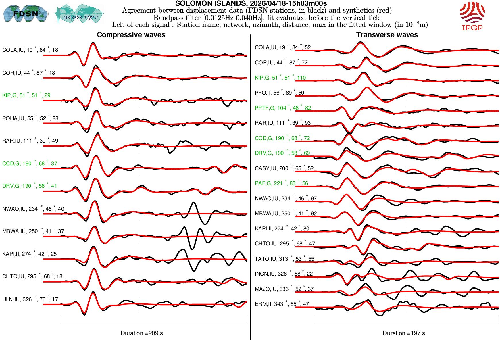 The SCARDEC solution is used here to predict the waveforms at all Geoscope stations received in real time and located at distances between 30° and 150° from the earthquake. All available location codes are used, for the BH* channels. In the range [30° - ~90°], the prediction is done on P and S(H) waves and in the range [~90° - 150°], it is done on PP and SS(H) waves. See agreement for P or PP waves (vertical components) between data and synthetics in Figure 1; see agreement for S(H) or SS(H) waves (horizontal components) between data (black) and synthetics (red) in Figure 2. Tables 1 and 2 provide quantitative estimates of these agreements.