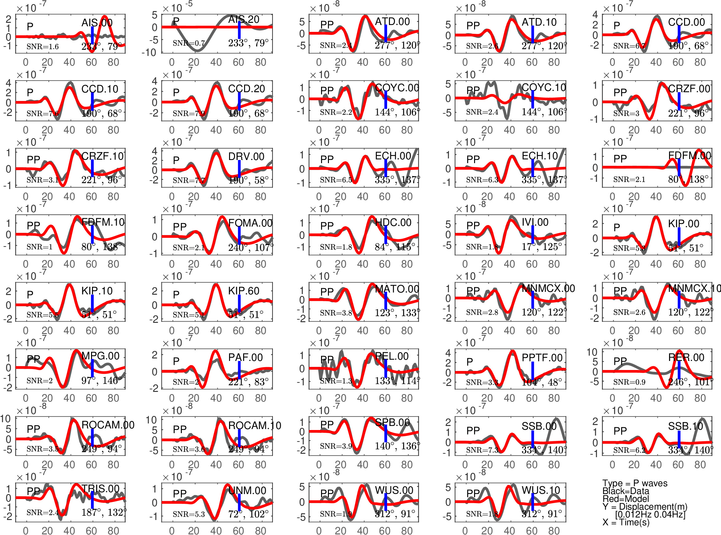 Figure 1: Agreement between data (black) and synthetics (red) for P or PP waves (the type of waves used is indicated in each subfigure). The comparison is shown with a time shift (noted 'Dt1' in Table 1), corresponding to the optimal fit ('Fit1' in Table 1) before the blue tick. Also indicated are the azimuth and distance of the station, and the signal to noise ratio (SNR). Note that the prediction done for PP waves is expected to be less accurate than the one for P waves.
