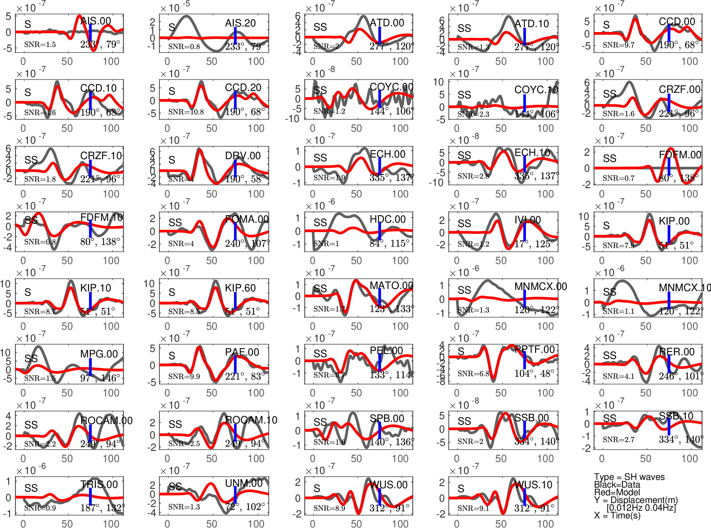 Figure 2: Same as Figure 1, but for S(H) or SS(H) waves (use of the rotated horizontal component along the transverse direction). See in Table 2 the quantitative estimates ('Dt1' and 'Fit1') corresponding to this Figure.