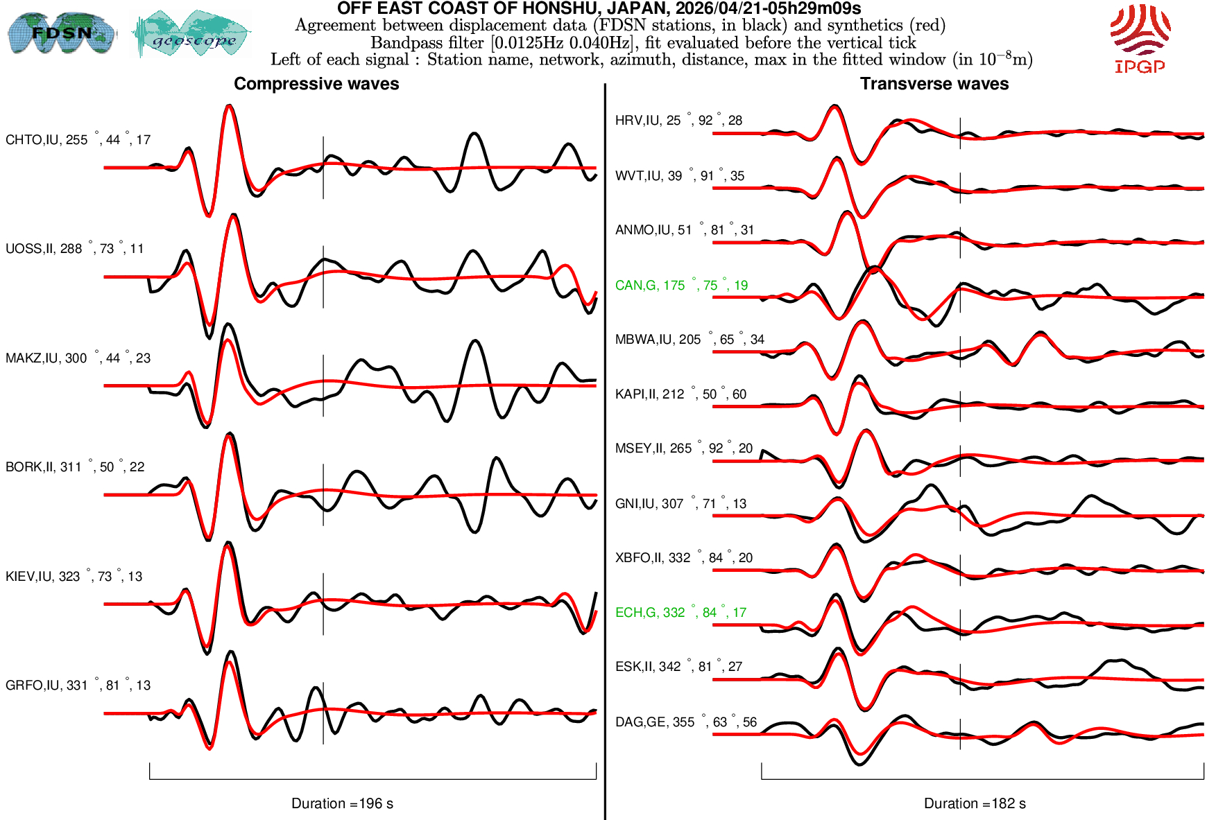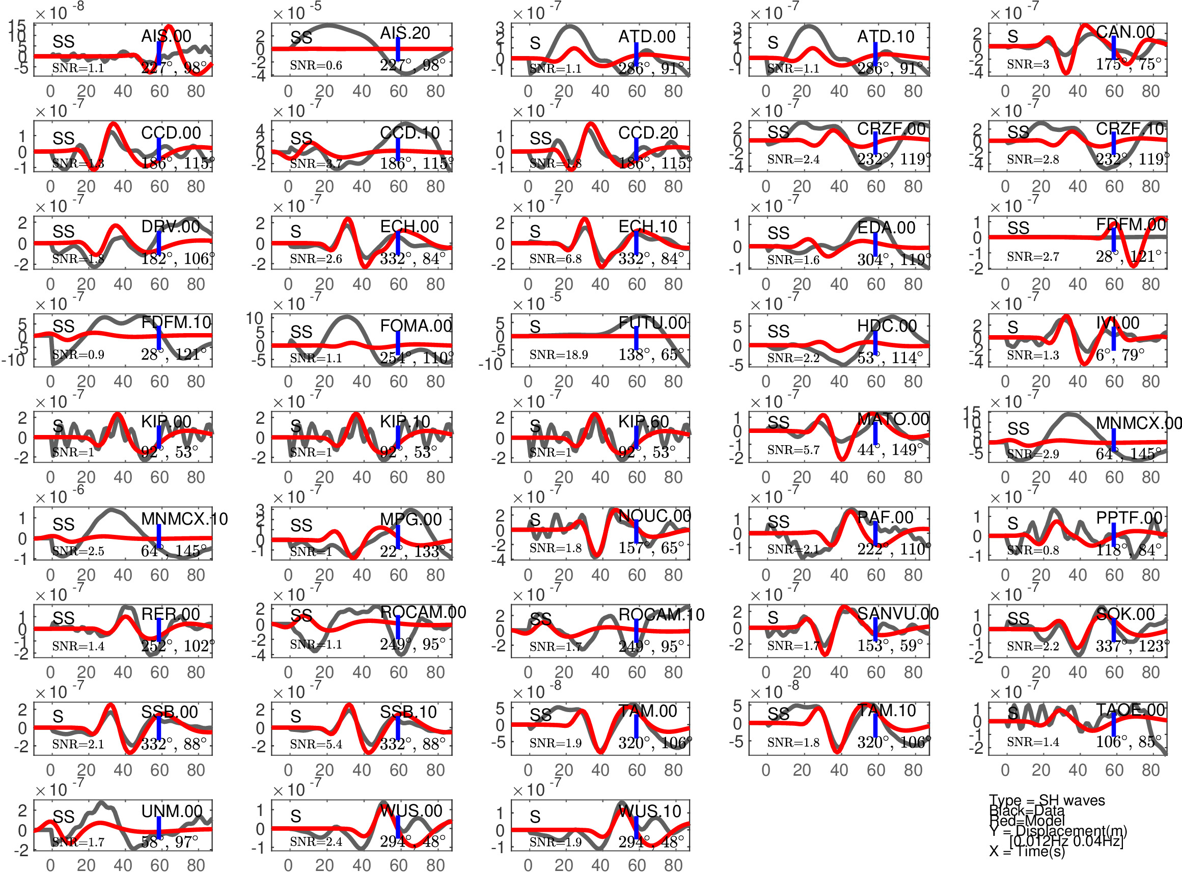 The SCARDEC solution is used here to predict the waveforms at all Geoscope stations received in real time and located at distances between 30° and 150° from the earthquake. All available location codes are used, for the BH* channels. In the range [30° - ~90°], the prediction is done on P and S(H) waves and in the range [~90° - 150°], it is done on PP and SS(H) waves. See agreement for P or PP waves (vertical components) between data and synthetics in Figure 1; see agreement for S(H) or SS(H) waves (horizontal components) between data (black) and synthetics (red) in Figure 2. Tables 1 and 2 provide quantitative estimates of these agreements.