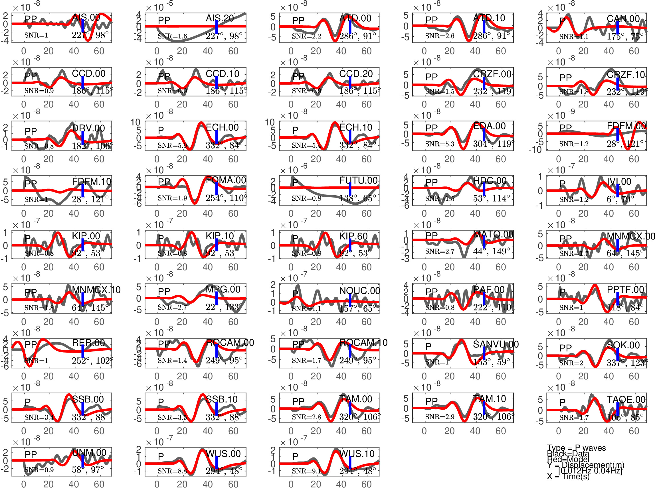 Figure 1: Agreement between data (black) and synthetics (red) for P or PP waves (the type of waves used is indicated in each subfigure). The comparison is shown with a time shift (noted 'Dt1' in Table 1), corresponding to the optimal fit ('Fit1' in Table 1) before the blue tick. Also indicated are the azimuth and distance of the station, and the signal to noise ratio (SNR). Note that the prediction done for PP waves is expected to be less accurate than the one for P waves.