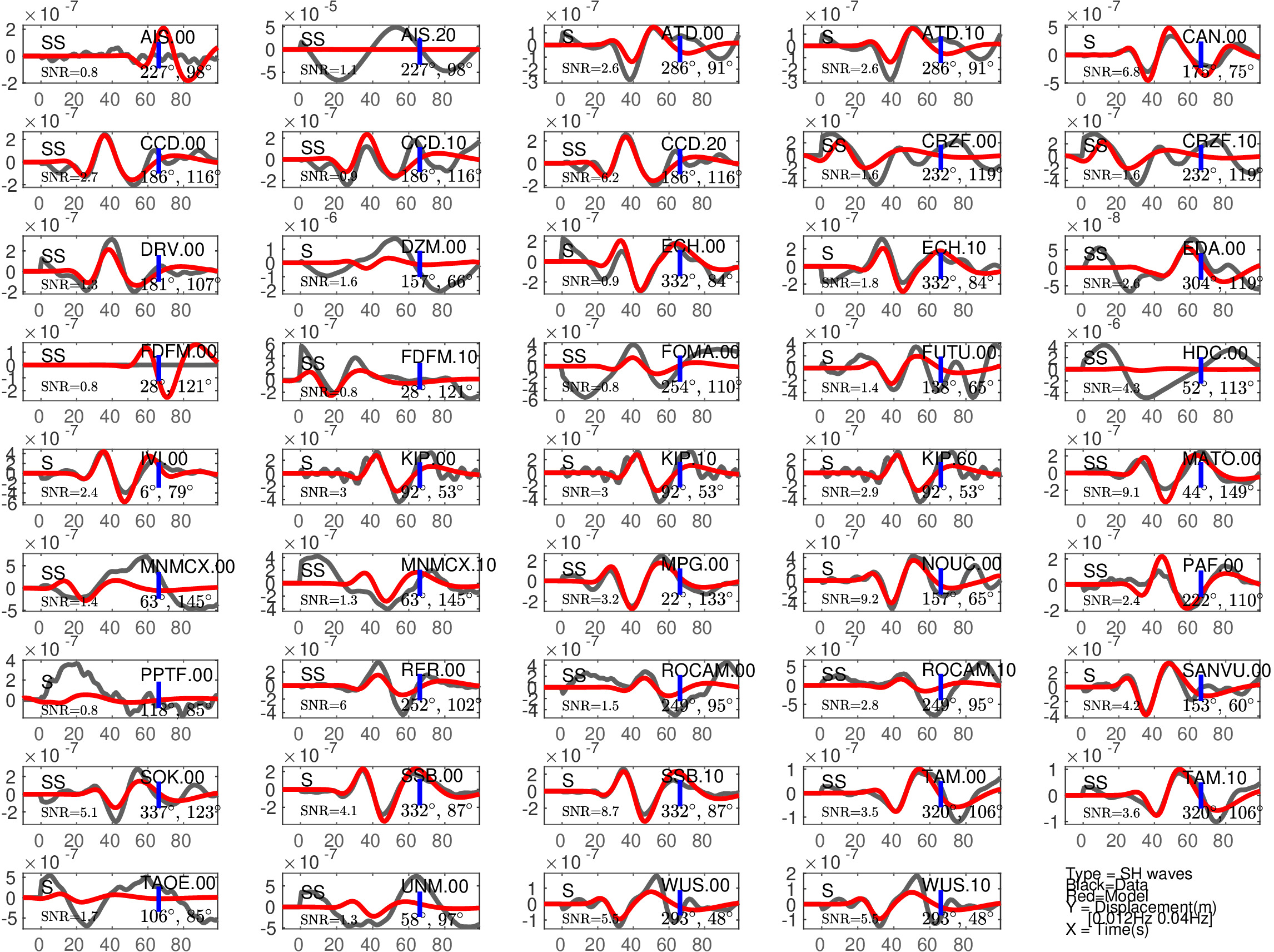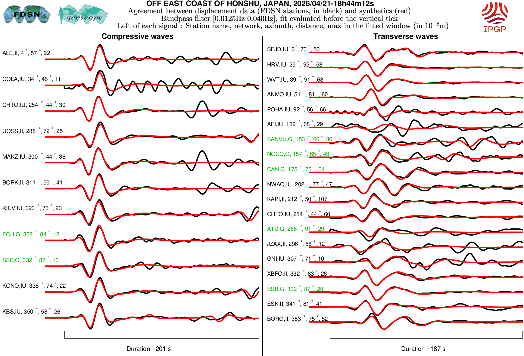 The SCARDEC solution is used here to predict the waveforms at all Geoscope stations received in real time and located at distances between 30° and 150° from the earthquake. All available location codes are used, for the BH* channels. In the range [30° - ~90°], the prediction is done on P and S(H) waves and in the range [~90° - 150°], it is done on PP and SS(H) waves. See agreement for P or PP waves (vertical components) between data and synthetics in Figure 1; see agreement for S(H) or SS(H) waves (horizontal components) between data (black) and synthetics (red) in Figure 2. Tables 1 and 2 provide quantitative estimates of these agreements.