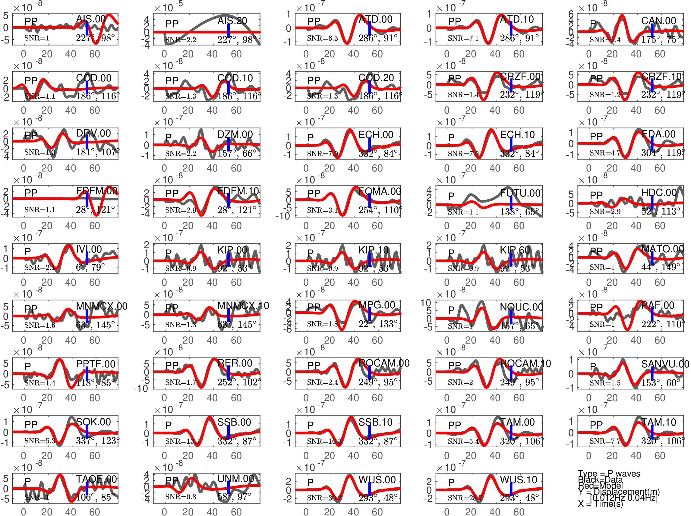 Figure 1: Agreement between data (black) and synthetics (red) for P or PP waves (the type of waves used is indicated in each subfigure). The comparison is shown with a time shift (noted 'Dt1' in Table 1), corresponding to the optimal fit ('Fit1' in Table 1) before the blue tick. Also indicated are the azimuth and distance of the station, and the signal to noise ratio (SNR). Note that the prediction done for PP waves is expected to be less accurate than the one for P waves.