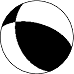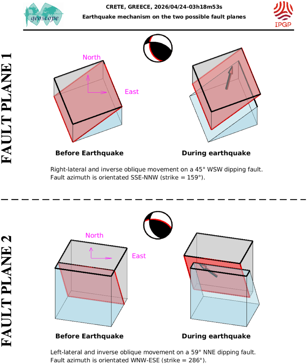 This figure illustrates how the two blocks separated by the seismic fault are displaced during the earthquake. These movements are deduced from the SCARDEC focal mechanism, on the two possible fault planes. Additional information (tectonics, near-fault measurements) is required to determine which one of these two hypotheses corresponds to the real movements during the earthquake.