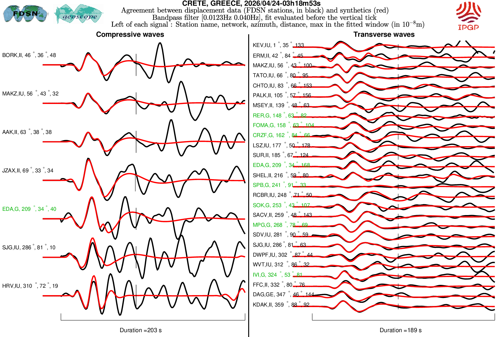 The SCARDEC solution is used here to predict the waveforms at all Geoscope stations received in real time and located at distances between 30° and 150° from the earthquake. All available location codes are used, for the BH* channels. In the range [30° - ~90°], the prediction is done on P and S(H) waves and in the range [~90° - 150°], it is done on PP and SS(H) waves. See agreement for P or PP waves (vertical components) between data and synthetics in Figure 1; see agreement for S(H) or SS(H) waves (horizontal components) between data (black) and synthetics (red) in Figure 2. Tables 1 and 2 provide quantitative estimates of these agreements.