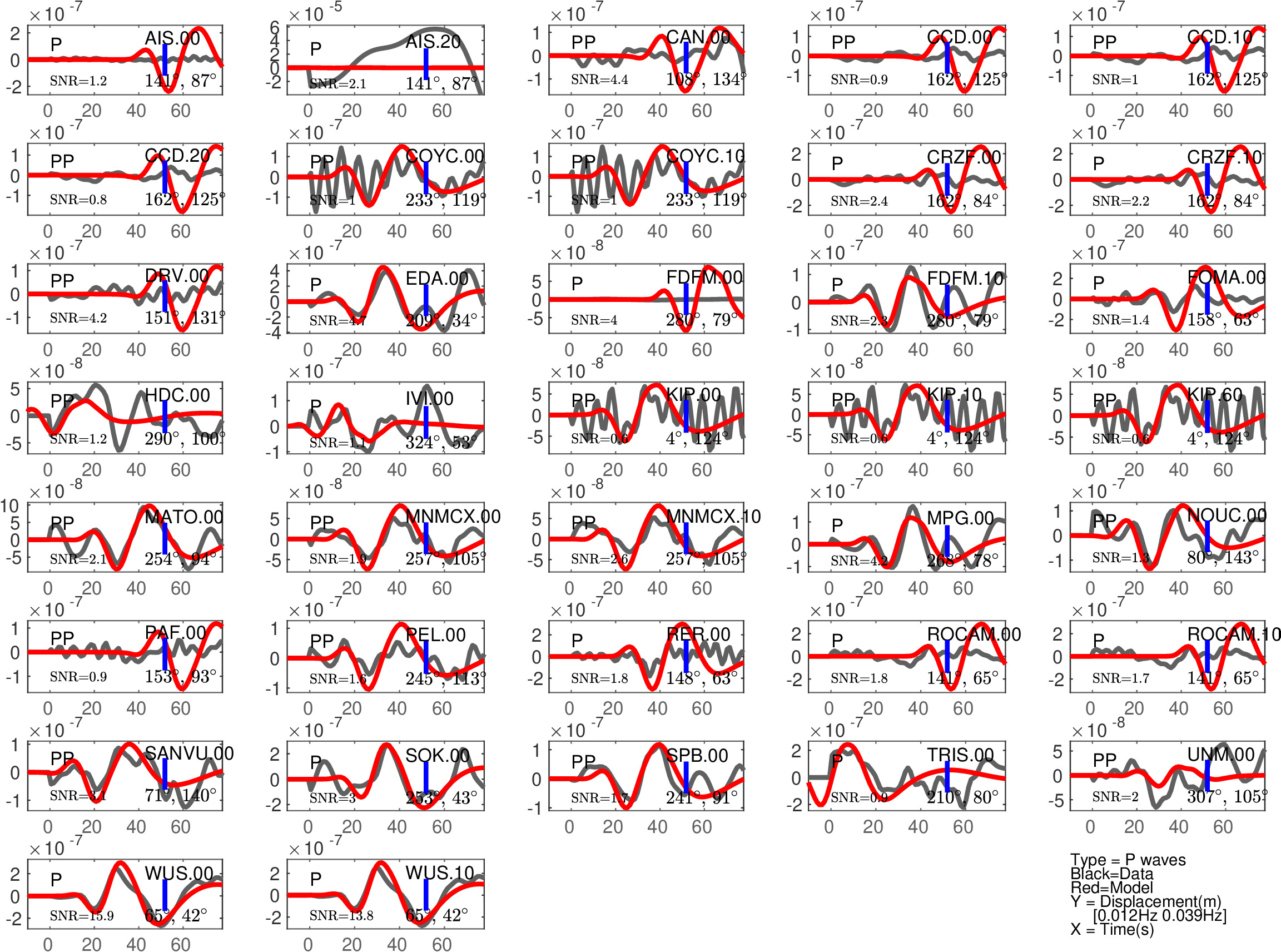 Figure 1: Agreement between data (black) and synthetics (red) for P or PP waves (the type of waves used is indicated in each subfigure). The comparison is shown with a time shift (noted 'Dt1' in Table 1), corresponding to the optimal fit ('Fit1' in Table 1) before the blue tick. Also indicated are the azimuth and distance of the station, and the signal to noise ratio (SNR). Note that the prediction done for PP waves is expected to be less accurate than the one for P waves.