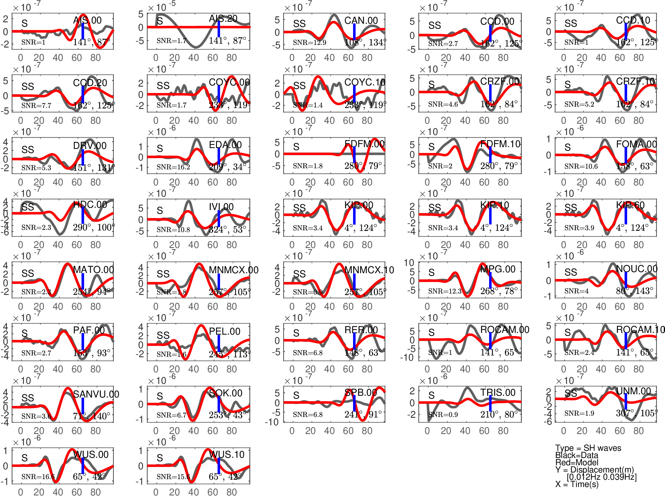 Figure 2: Same as Figure 1, but for S(H) or SS(H) waves (use of the rotated horizontal component along the transverse direction). See in Table 2 the quantitative estimates ('Dt1' and 'Fit1') corresponding to this Figure.
