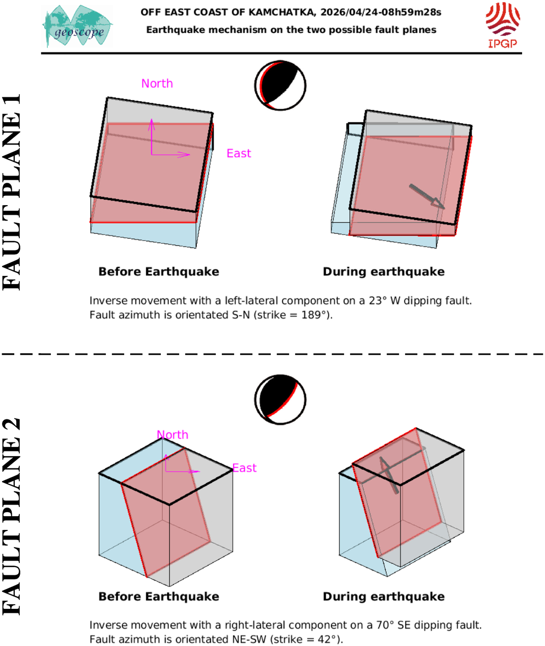 This figure illustrates how the two blocks separated by the seismic fault are displaced during the earthquake. These movements are deduced from the SCARDEC focal mechanism, on the two possible fault planes. Additional information (tectonics, near-fault measurements) is required to determine which one of these two hypotheses corresponds to the real movements during the earthquake.