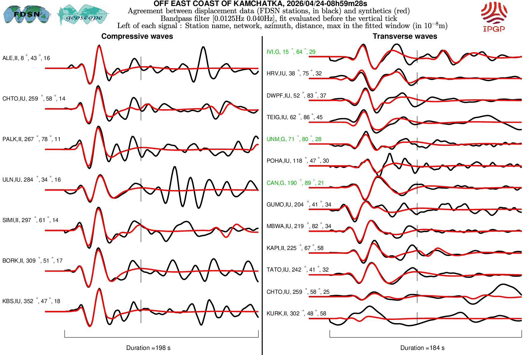 The SCARDEC solution is used here to predict the waveforms at all Geoscope stations received in real time and located at distances between 30° and 150° from the earthquake. All available location codes are used, for the BH* channels. In the range [30° - ~90°], the prediction is done on P and S(H) waves and in the range [~90° - 150°], it is done on PP and SS(H) waves. See agreement for P or PP waves (vertical components) between data and synthetics in Figure 1; see agreement for S(H) or SS(H) waves (horizontal components) between data (black) and synthetics (red) in Figure 2. Tables 1 and 2 provide quantitative estimates of these agreements.