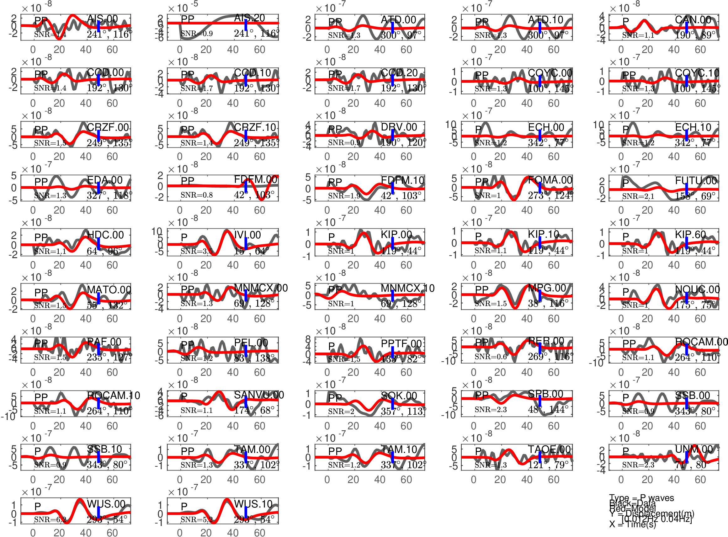 Figure 1: Agreement between data (black) and synthetics (red) for P or PP waves (the type of waves used is indicated in each subfigure). The comparison is shown with a time shift (noted 'Dt1' in Table 1), corresponding to the optimal fit ('Fit1' in Table 1) before the blue tick. Also indicated are the azimuth and distance of the station, and the signal to noise ratio (SNR). Note that the prediction done for PP waves is expected to be less accurate than the one for P waves.