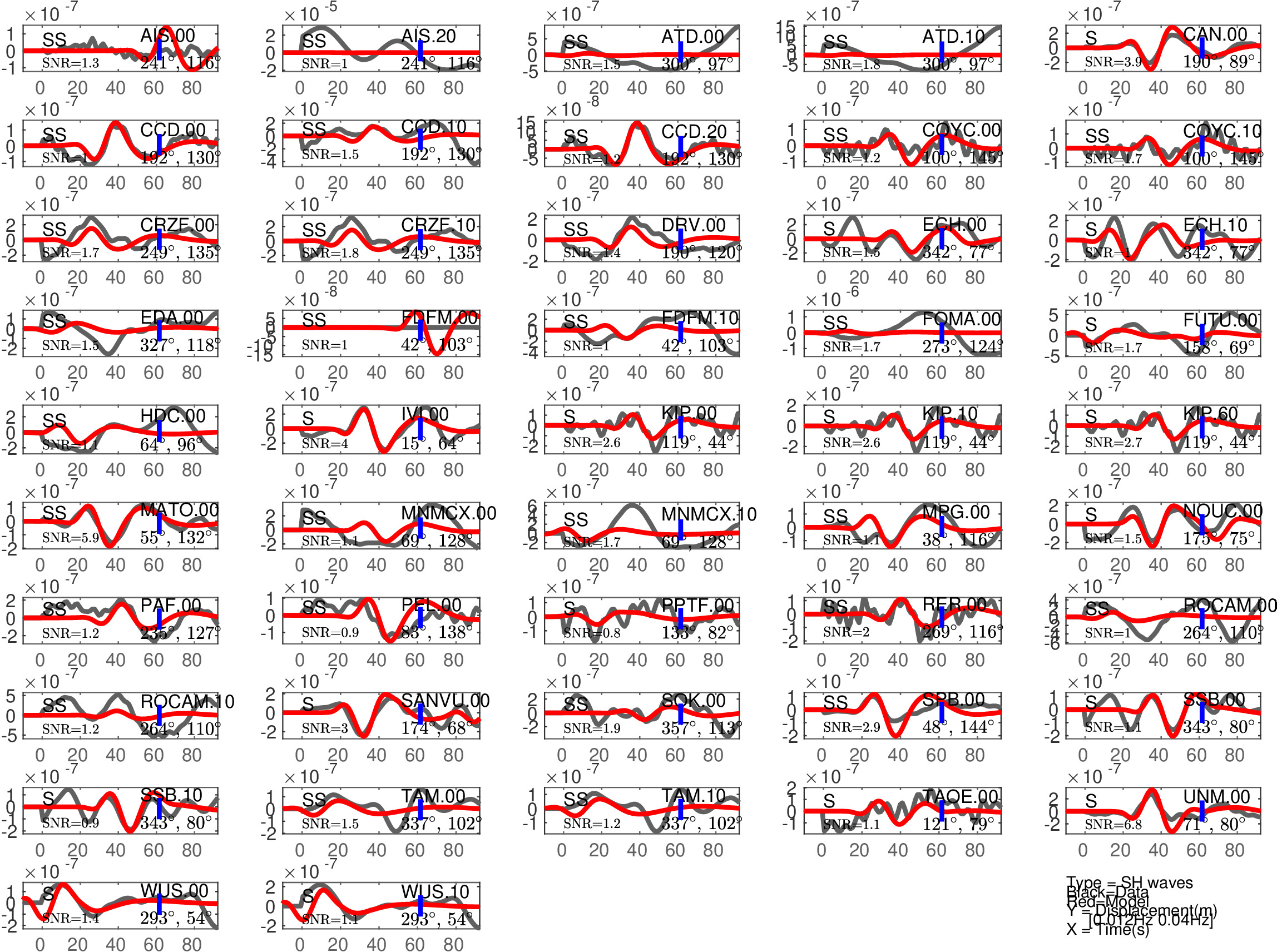 Figure 2: Same as Figure 1, but for S(H) or SS(H) waves (use of the rotated horizontal component along the transverse direction). See in Table 2 the quantitative estimates ('Dt1' and 'Fit1') corresponding to this Figure.