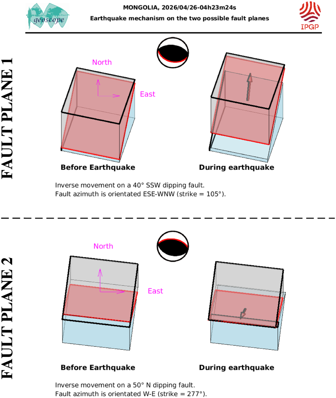 This figure illustrates how the two blocks separated by the seismic fault are displaced during the earthquake. These movements are deduced from the SCARDEC focal mechanism, on the two possible fault planes. Additional information (tectonics, near-fault measurements) is required to determine which one of these two hypotheses corresponds to the real movements during the earthquake.