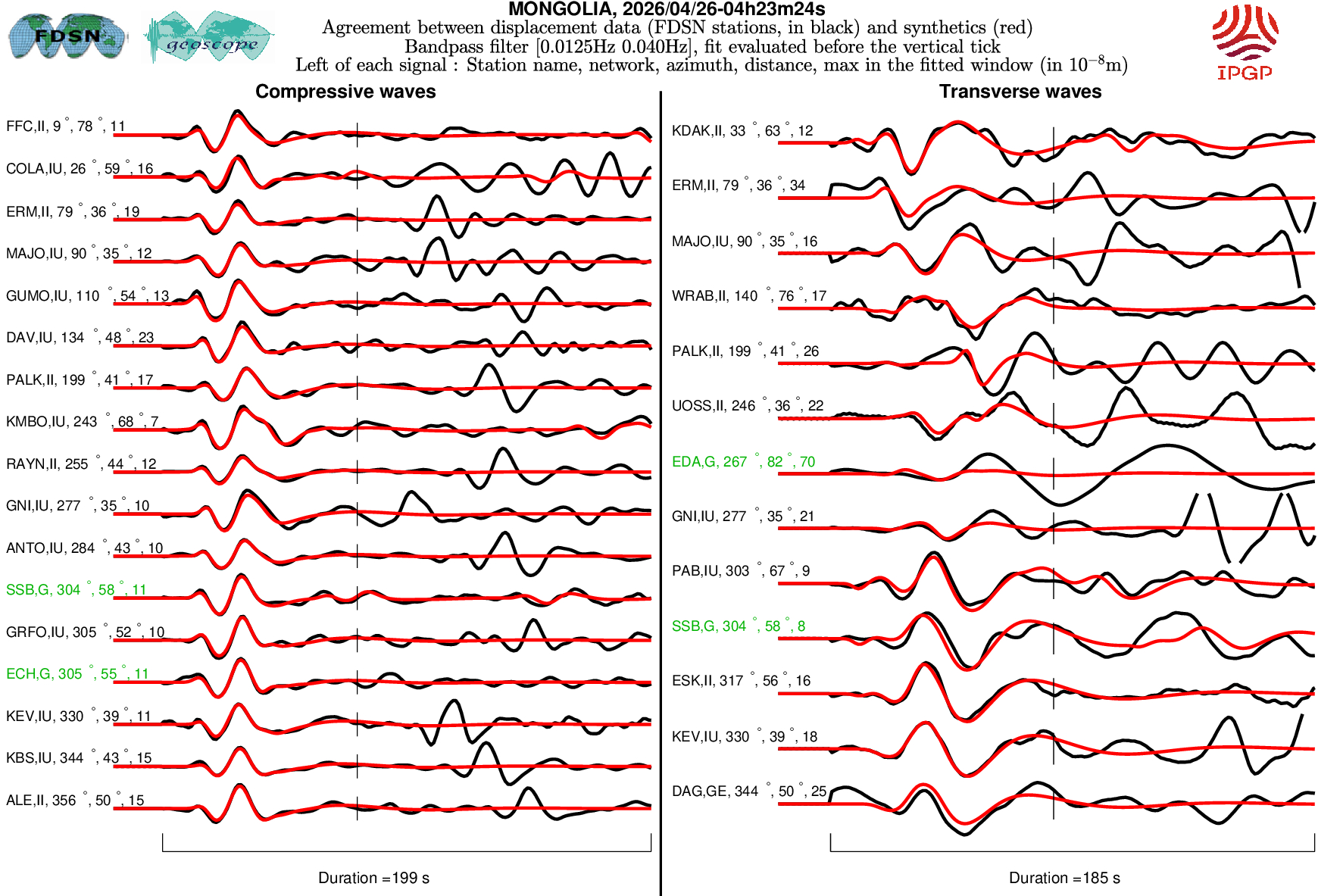 The SCARDEC solution is used here to predict the waveforms at all Geoscope stations received in real time and located at distances between 30° and 150° from the earthquake. All available location codes are used, for the BH* channels. In the range [30° - ~90°], the prediction is done on P and S(H) waves and in the range [~90° - 150°], it is done on PP and SS(H) waves. See agreement for P or PP waves (vertical components) between data and synthetics in Figure 1; see agreement for S(H) or SS(H) waves (horizontal components) between data (black) and synthetics (red) in Figure 2. Tables 1 and 2 provide quantitative estimates of these agreements.
