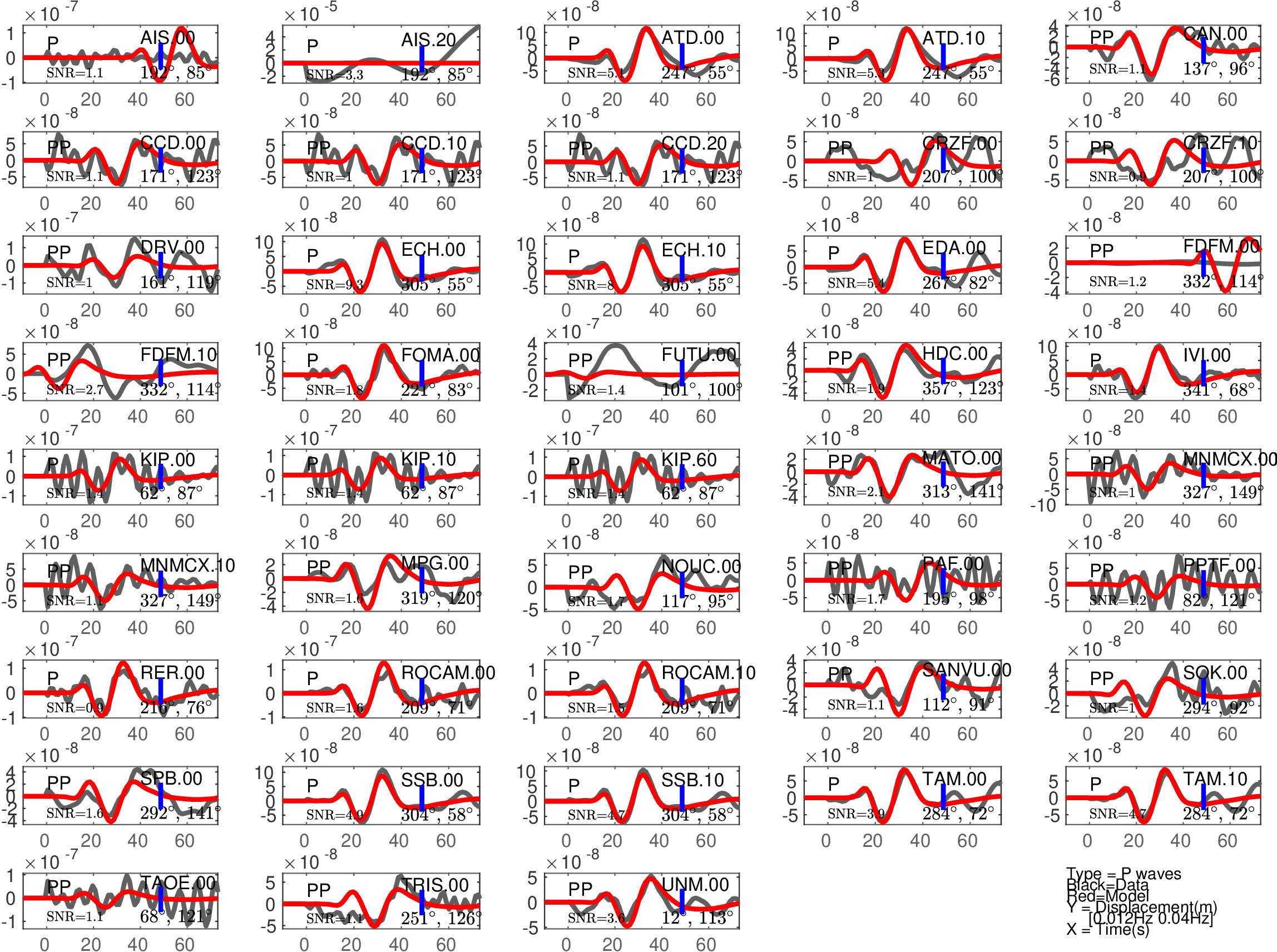 Figure 1: Agreement between data (black) and synthetics (red) for P or PP waves (the type of waves used is indicated in each subfigure). The comparison is shown with a time shift (noted 'Dt1' in Table 1), corresponding to the optimal fit ('Fit1' in Table 1) before the blue tick. Also indicated are the azimuth and distance of the station, and the signal to noise ratio (SNR). Note that the prediction done for PP waves is expected to be less accurate than the one for P waves.