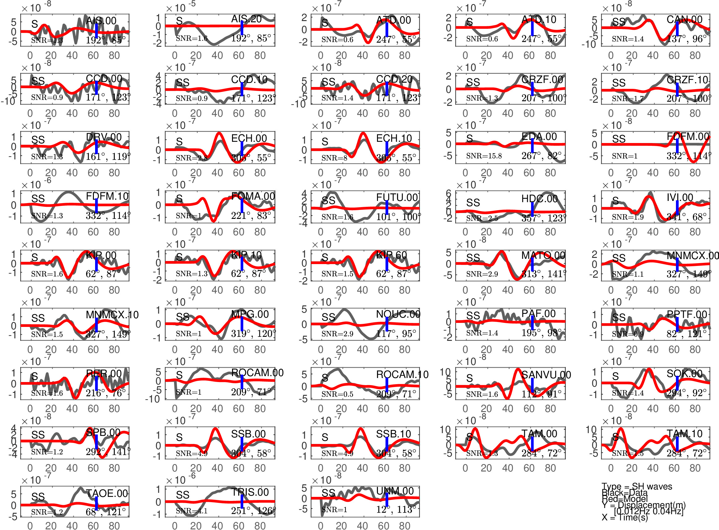 Figure 2: Same as Figure 1, but for S(H) or SS(H) waves (use of the rotated horizontal component along the transverse direction). See in Table 2 the quantitative estimates ('Dt1' and 'Fit1') corresponding to this Figure.