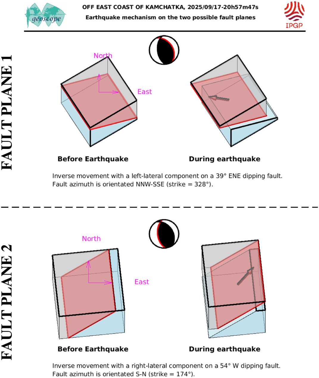 This figure illustrates how the two blocks separated by the seismic fault are displaced during the earthquake. These movements are deduced from the SCARDEC focal mechanism, on the two possible fault planes. Additional information (tectonics, near-fault measurements) is required to determine which one of these two hypotheses corresponds to the real movements during the earthquake.