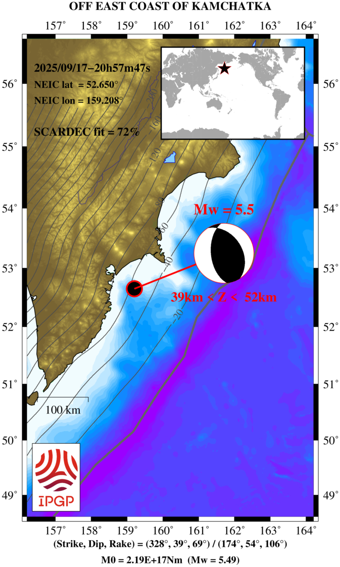 In the near-real time configuration presented here, the solution is typically posted 45 minutes after earthquake occurrence. Solution includes a map summing up the SCARDEC results and a figure showing the agreement to the data. The map presents the earthquake location (together with the plate boundaries from Bird [2003] and the slab contours of SLAB 1.0 [Hayes et al., 2012]) and the main SCARDEC source parameters. Numerical values of focal mechanism parameters and seismic moment are written below the map. The data agreement figure compares the SCARDEC synthetics (red) with the FDSN data (black), in the frequency range used for focal mechanism determination. The name of GEOSCOPE stations is written in green.