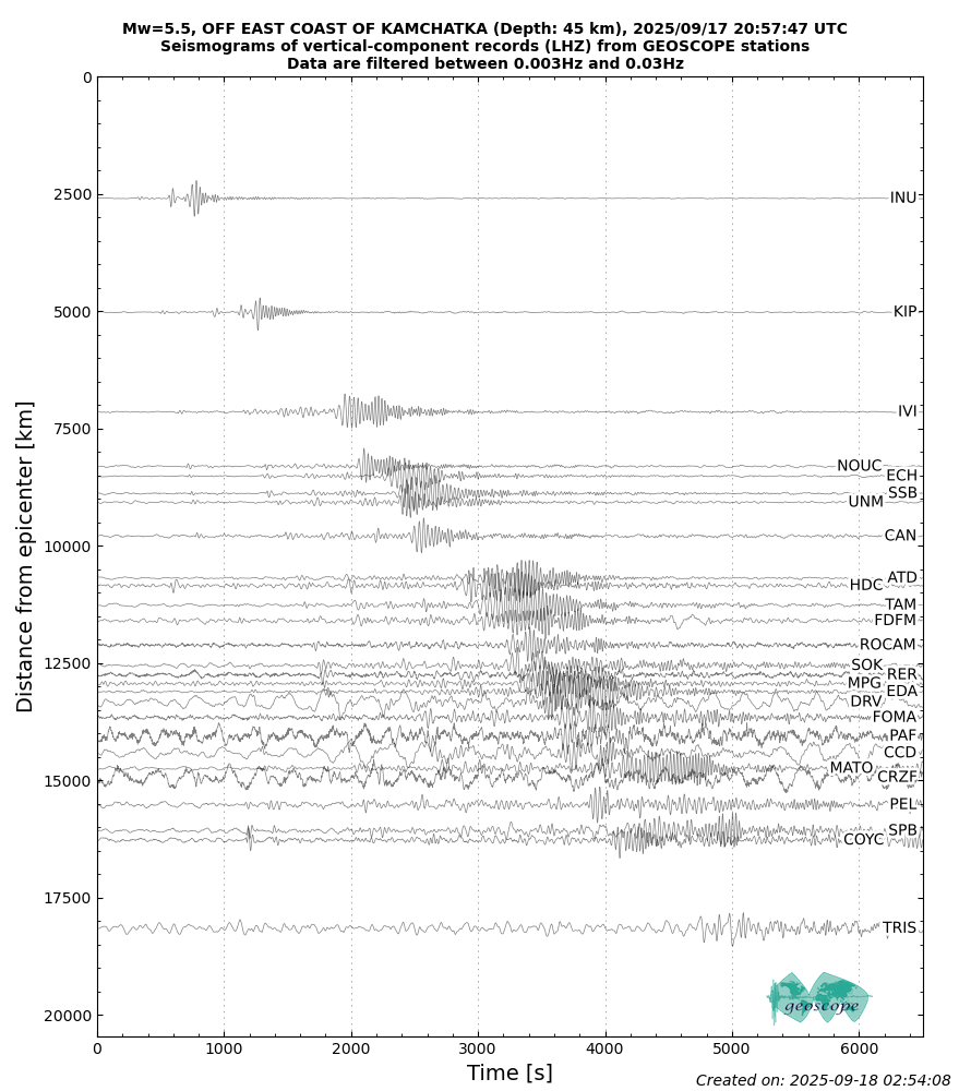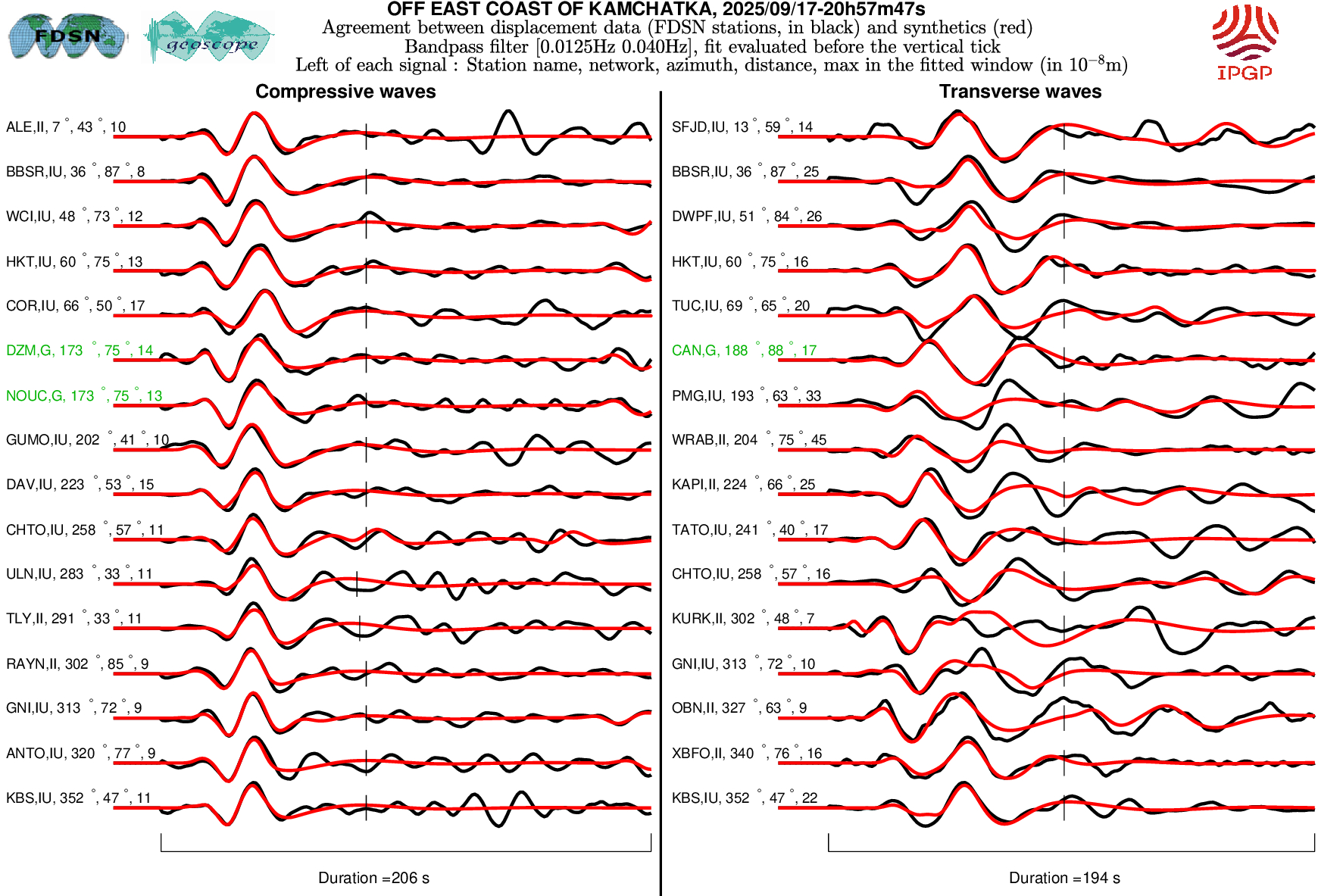 The SCARDEC solution is used here to predict the waveforms at all Geoscope stations received in real time and located at distances between 30° and 150° from the earthquake. All available location codes are used, for the BH* channels. In the range [30° - ~90°], the prediction is done on P and S(H) waves and in the range [~90° - 150°], it is done on PP and SS(H) waves. See agreement for P or PP waves (vertical components) between data and synthetics in Figure 1; see agreement for S(H) or SS(H) waves (horizontal components) between data (black) and synthetics (red) in Figure 2. Tables 1 and 2 provide quantitative estimates of these agreements.