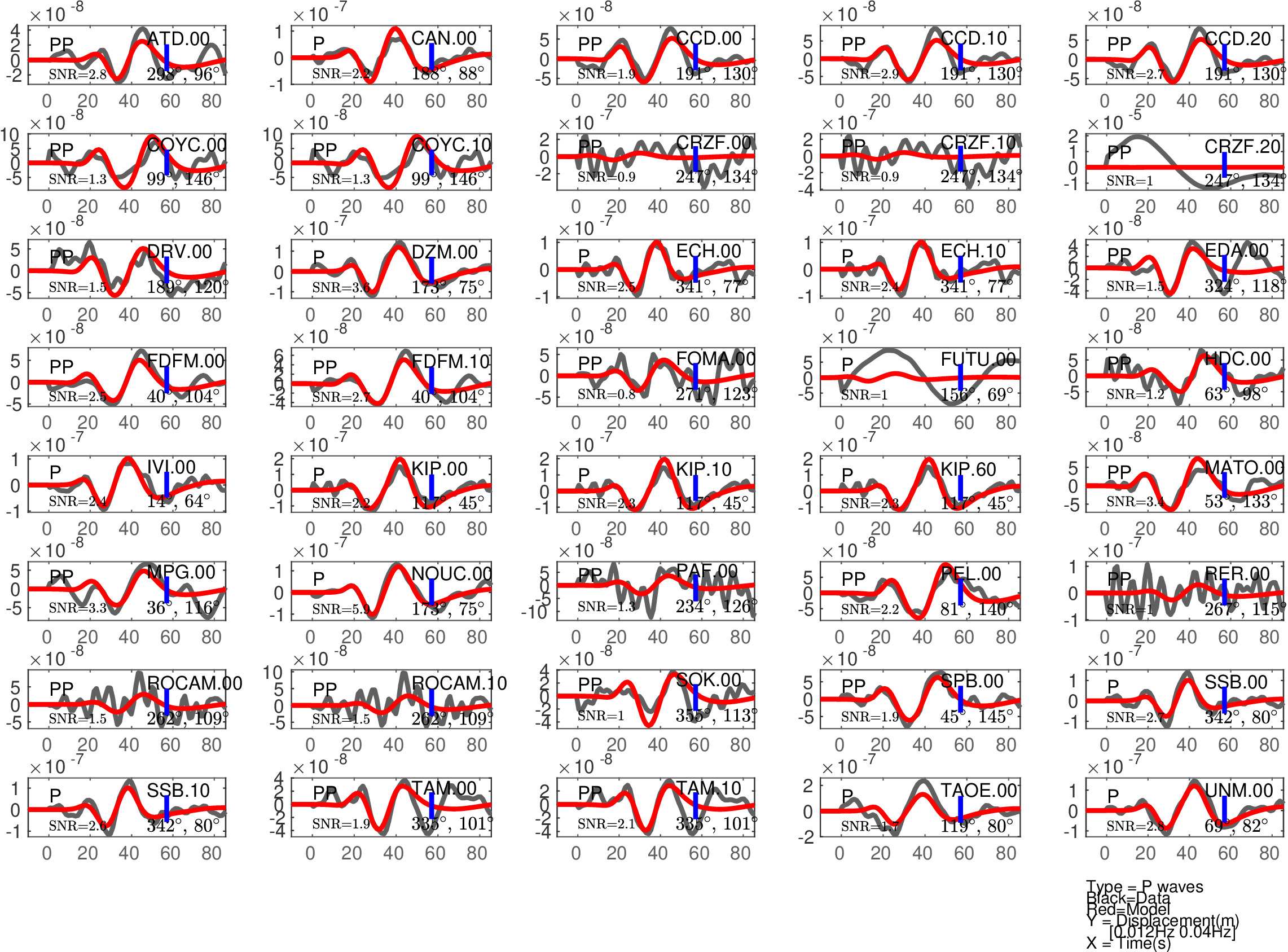 Figure 1: Agreement between data (black) and synthetics (red) for P or PP waves (the type of waves used is indicated in each subfigure). The comparison is shown with a time shift (noted 'Dt1' in Table 1), corresponding to the optimal fit ('Fit1' in Table 1) before the blue tick. Also indicated are the azimuth and distance of the station, and the signal to noise ratio (SNR). Note that the prediction done for PP waves is expected to be less accurate than the one for P waves.