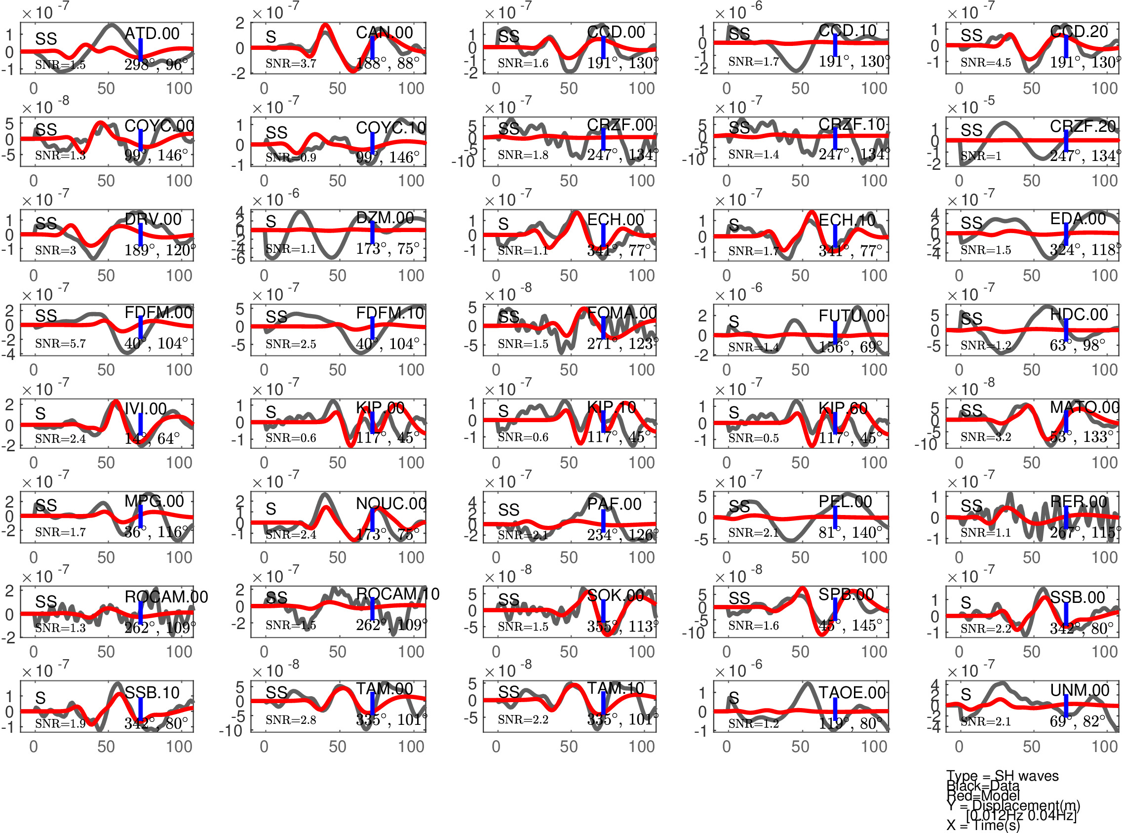 Figure 2: Same as Figure 1, but for S(H) or SS(H) waves (use of the rotated horizontal component along the transverse direction). See in Table 2 the quantitative estimates ('Dt1' and 'Fit1') corresponding to this Figure.