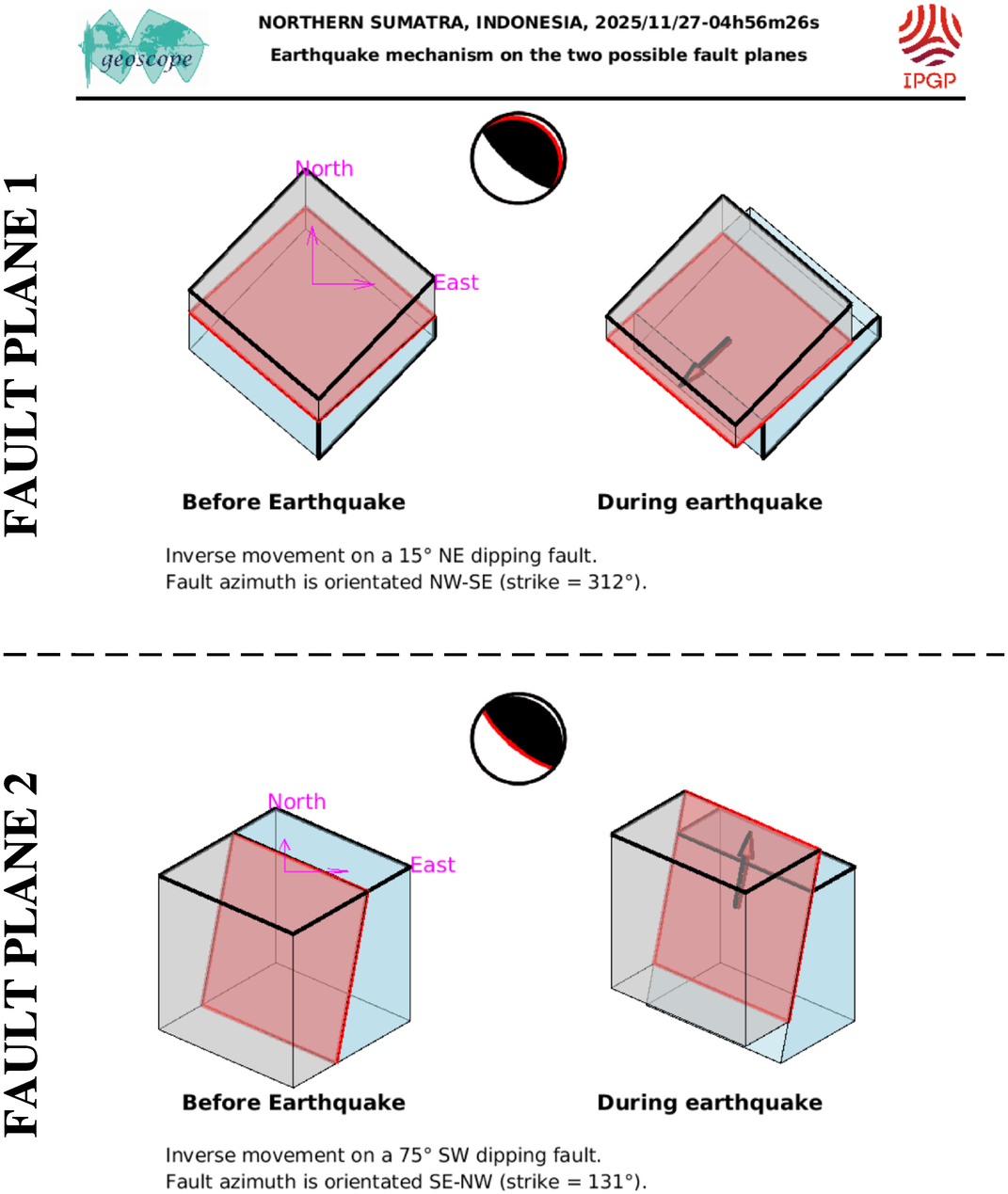 This figure illustrates how the two blocks separated by the seismic fault are displaced during the earthquake. These movements are deduced from the SCARDEC focal mechanism, on the two possible fault planes. Additional information (tectonics, near-fault measurements) is required to determine which one of these two hypotheses corresponds to the real movements during the earthquake.