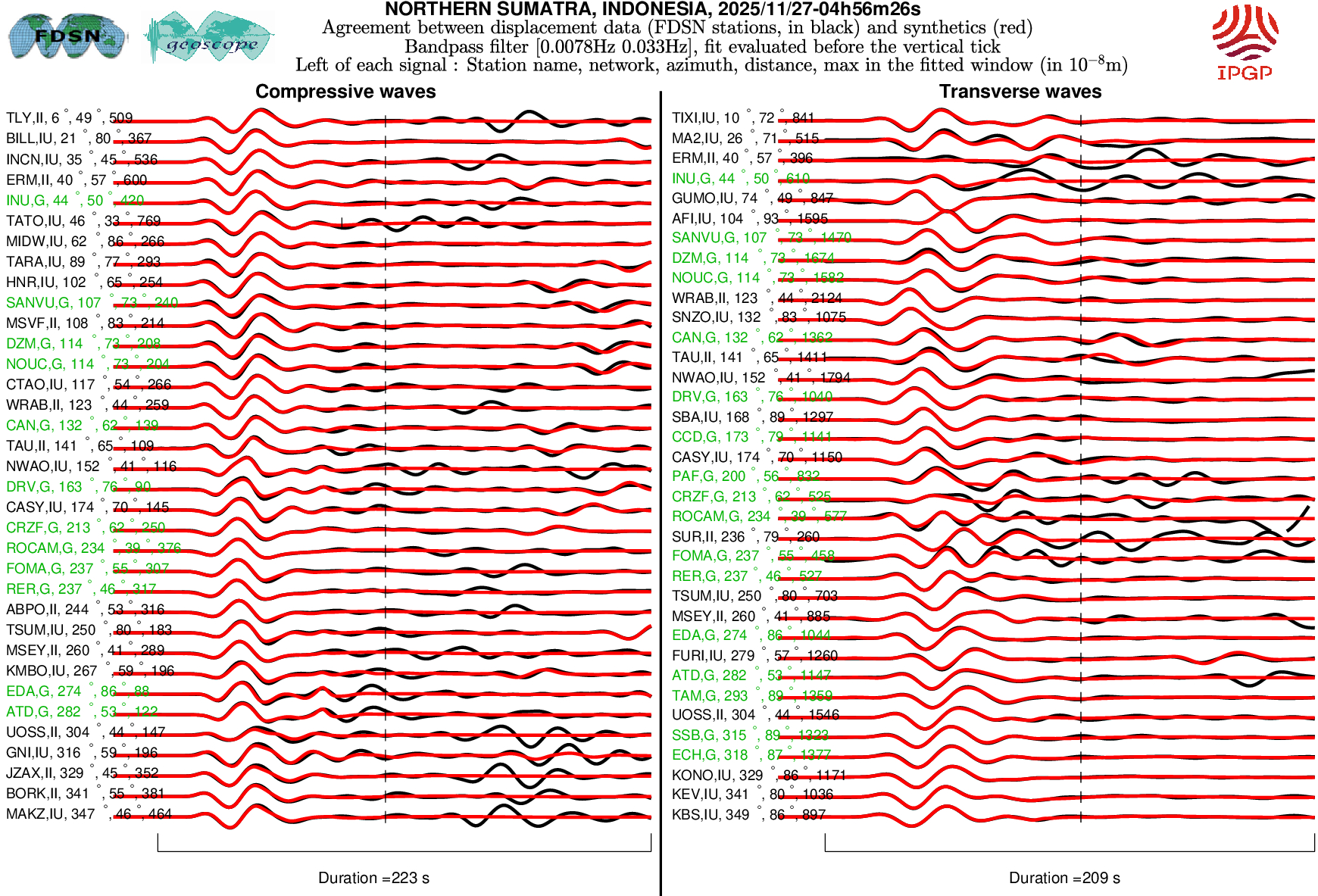 The SCARDEC solution is used here to predict the waveforms at all Geoscope stations received in real time and located at distances between 30° and 150° from the earthquake. All available location codes are used, for the BH* channels. In the range [30° - ~90°], the prediction is done on P and S(H) waves and in the range [~90° - 150°], it is done on PP and SS(H) waves. See agreement for P or PP waves (vertical components) between data and synthetics in Figure 1; see agreement for S(H) or SS(H) waves (horizontal components) between data (black) and synthetics (red) in Figure 2. Tables 1 and 2 provide quantitative estimates of these agreements.