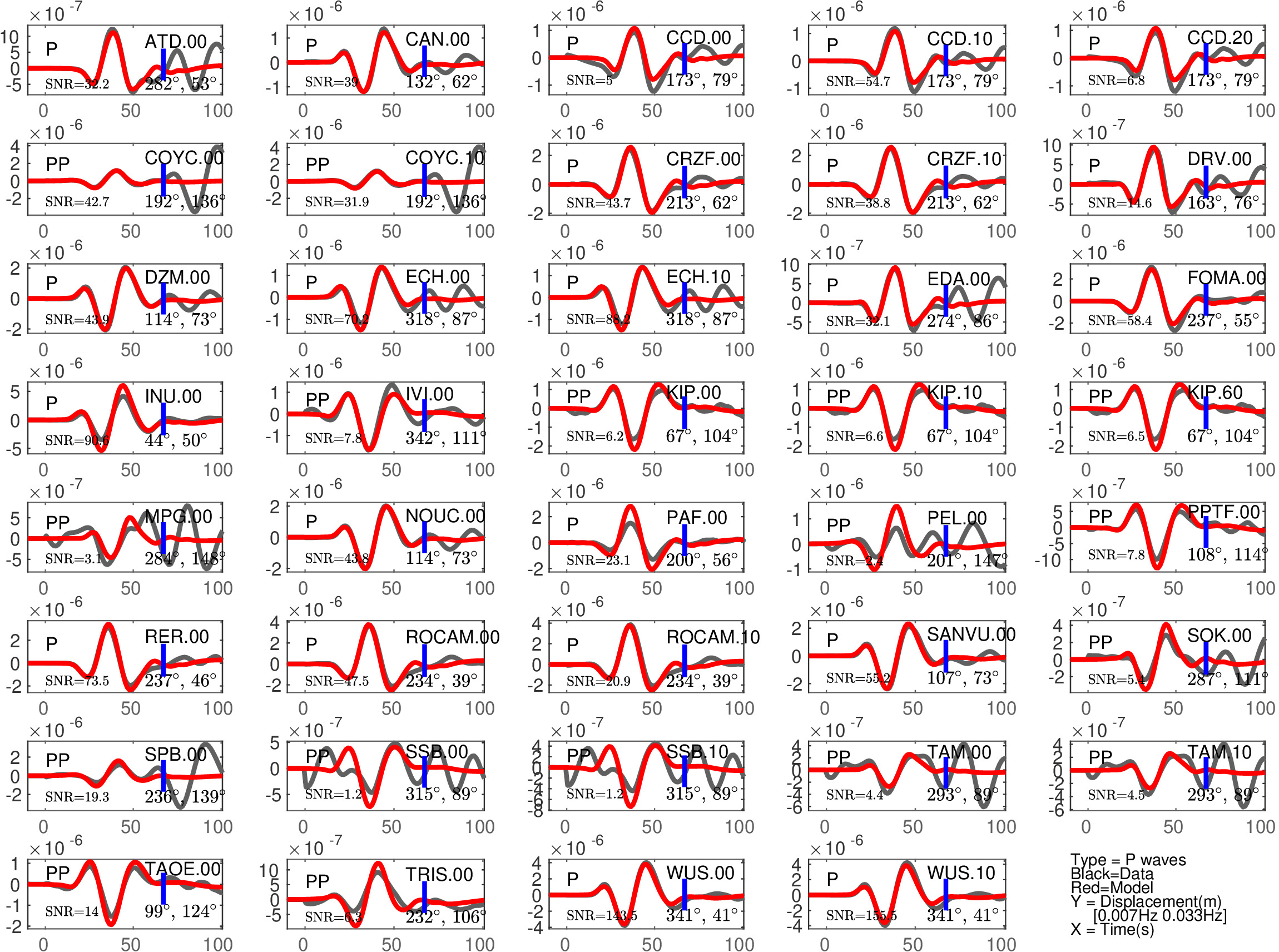 Figure 1: Agreement between data (black) and synthetics (red) for P or PP waves (the type of waves used is indicated in each subfigure). The comparison is shown with a time shift (noted 'Dt1' in Table 1), corresponding to the optimal fit ('Fit1' in Table 1) before the blue tick. Also indicated are the azimuth and distance of the station, and the signal to noise ratio (SNR). Note that the prediction done for PP waves is expected to be less accurate than the one for P waves.