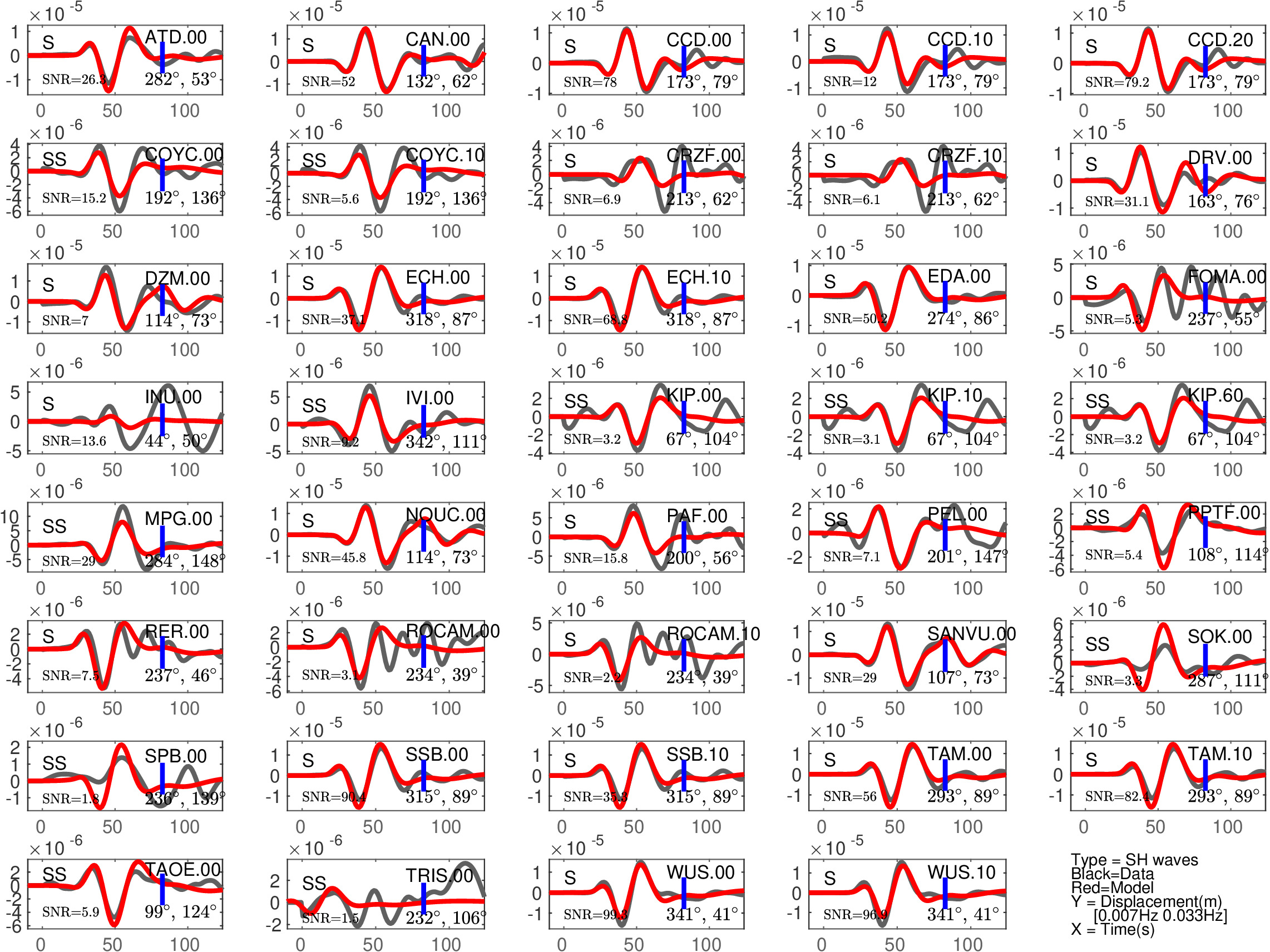 Figure 2: Same as Figure 1, but for S(H) or SS(H) waves (use of the rotated horizontal component along the transverse direction). See in Table 2 the quantitative estimates ('Dt1' and 'Fit1') corresponding to this Figure.