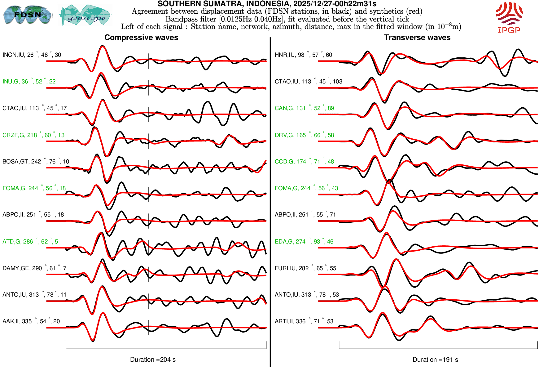 The SCARDEC solution is used here to predict the waveforms at all Geoscope stations received in real time and located at distances between 30° and 150° from the earthquake. All available location codes are used, for the BH* channels. In the range [30° - ~90°], the prediction is done on P and S(H) waves and in the range [~90° - 150°], it is done on PP and SS(H) waves. See agreement for P or PP waves (vertical components) between data and synthetics in Figure 1; see agreement for S(H) or SS(H) waves (horizontal components) between data (black) and synthetics (red) in Figure 2. Tables 1 and 2 provide quantitative estimates of these agreements.