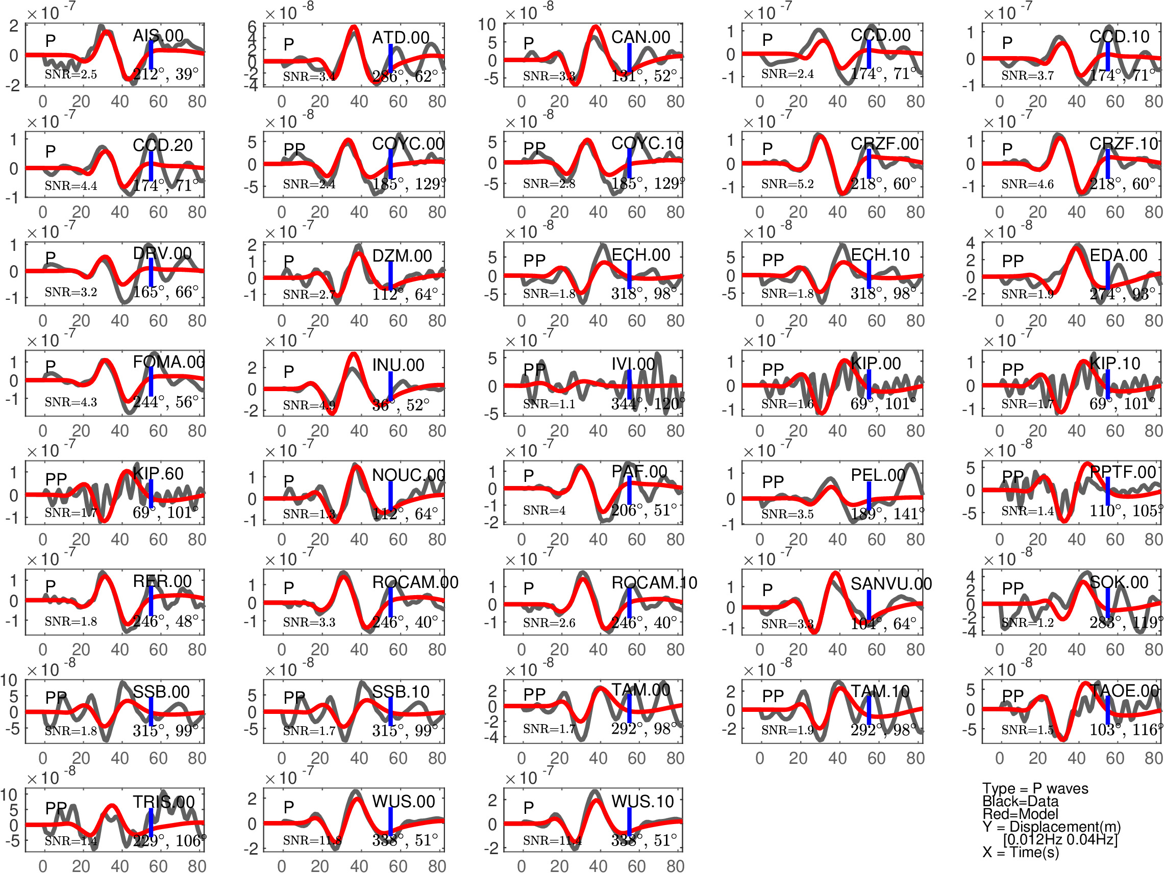Figure 1: Agreement between data (black) and synthetics (red) for P or PP waves (the type of waves used is indicated in each subfigure). The comparison is shown with a time shift (noted 'Dt1' in Table 1), corresponding to the optimal fit ('Fit1' in Table 1) before the blue tick. Also indicated are the azimuth and distance of the station, and the signal to noise ratio (SNR). Note that the prediction done for PP waves is expected to be less accurate than the one for P waves.