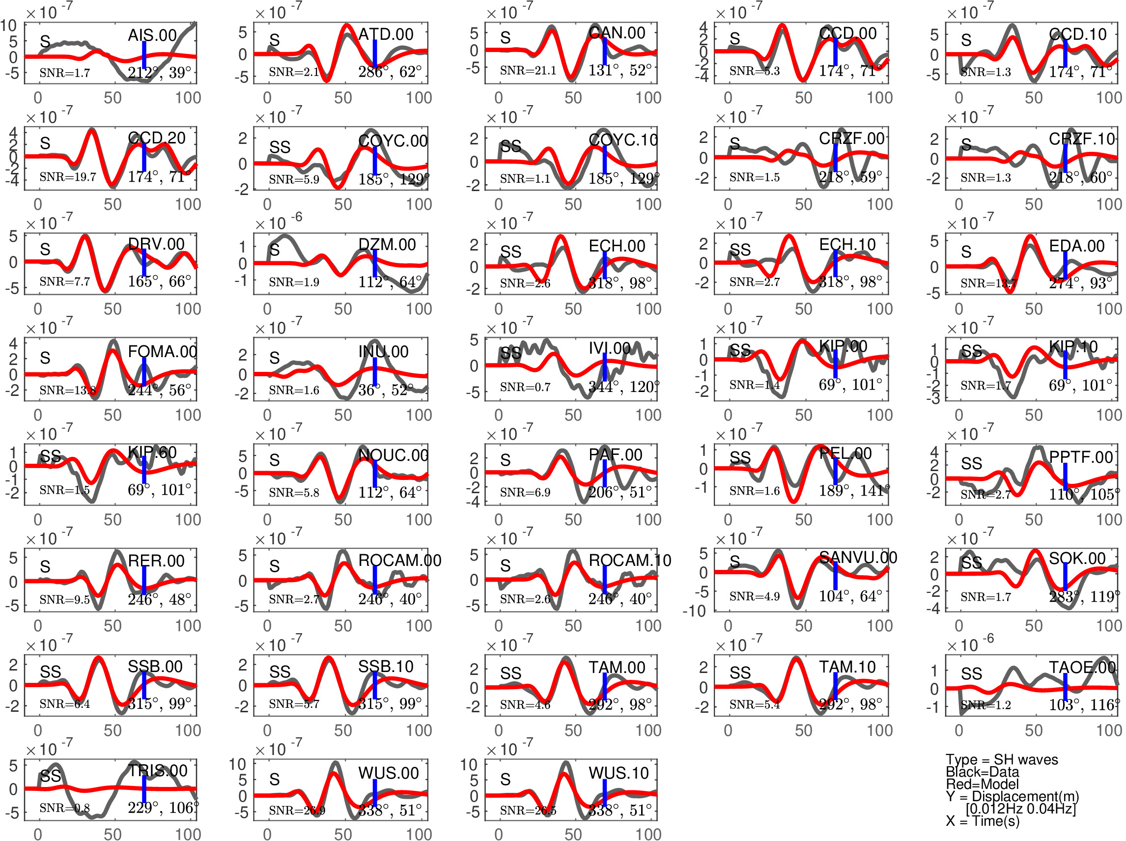 Figure 2: Same as Figure 1, but for S(H) or SS(H) waves (use of the rotated horizontal component along the transverse direction). See in Table 2 the quantitative estimates ('Dt1' and 'Fit1') corresponding to this Figure.
