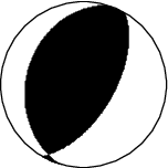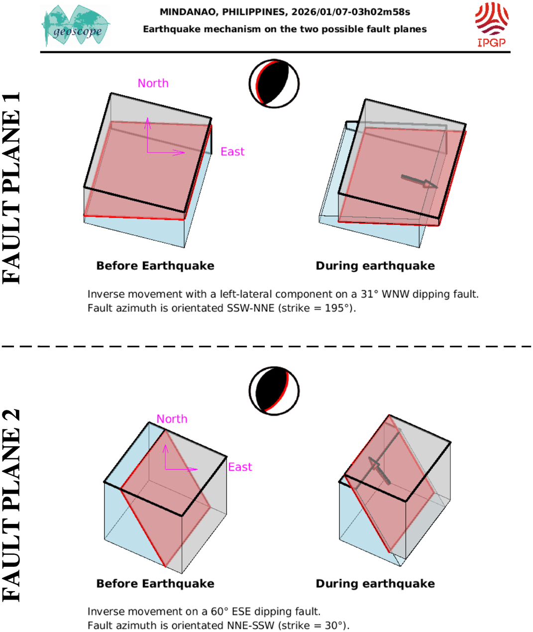 This figure illustrates how the two blocks separated by the seismic fault are displaced during the earthquake. These movements are deduced from the SCARDEC focal mechanism, on the two possible fault planes. Additional information (tectonics, near-fault measurements) is required to determine which one of these two hypotheses corresponds to the real movements during the earthquake.