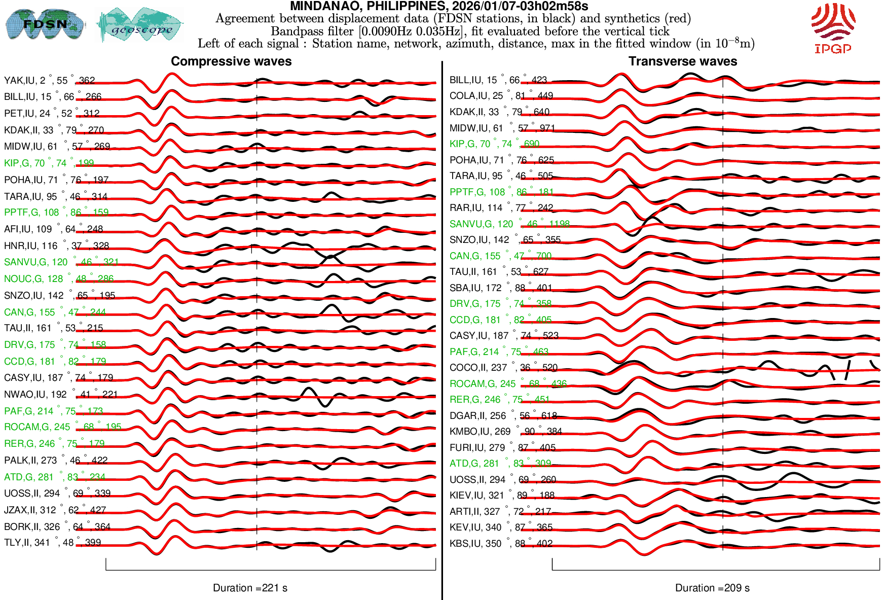 The SCARDEC solution is used here to predict the waveforms at all Geoscope stations received in real time and located at distances between 30° and 150° from the earthquake. All available location codes are used, for the BH* channels. In the range [30° - ~90°], the prediction is done on P and S(H) waves and in the range [~90° - 150°], it is done on PP and SS(H) waves. See agreement for P or PP waves (vertical components) between data and synthetics in Figure 1; see agreement for S(H) or SS(H) waves (horizontal components) between data (black) and synthetics (red) in Figure 2. Tables 1 and 2 provide quantitative estimates of these agreements.