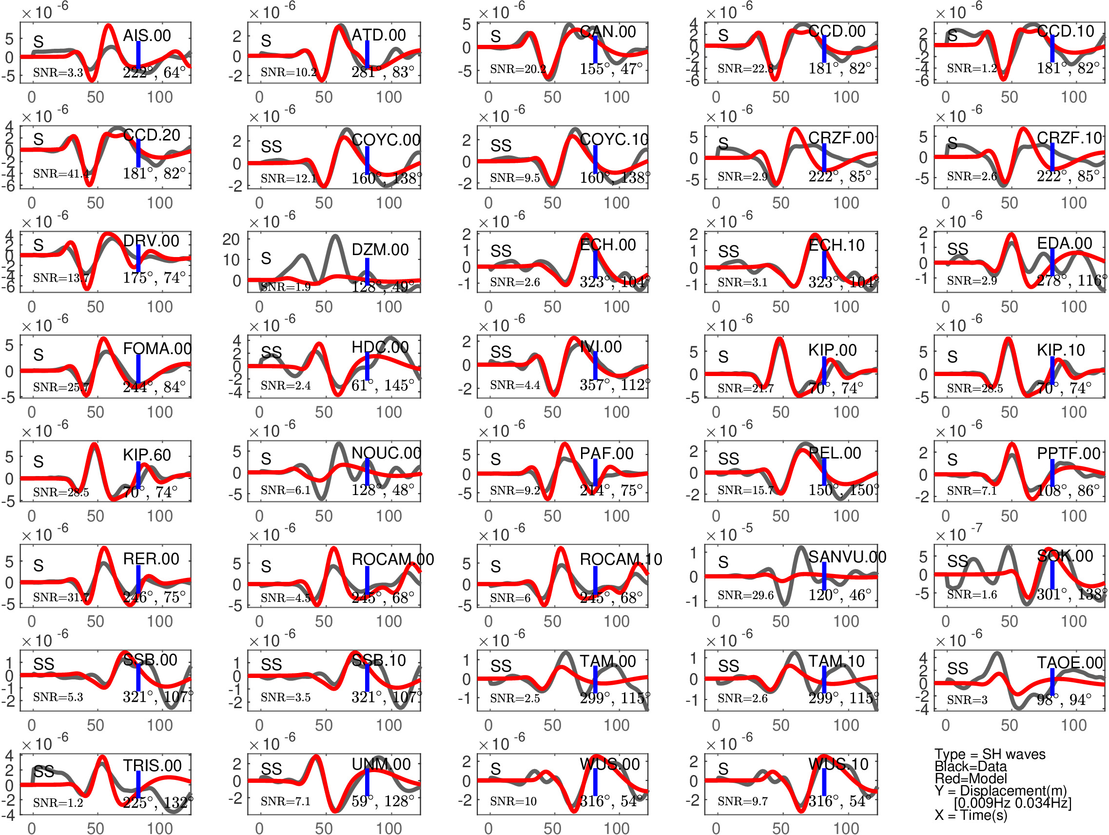 Figure 2: Same as Figure 1, but for S(H) or SS(H) waves (use of the rotated horizontal component along the transverse direction). See in Table 2 the quantitative estimates ('Dt1' and 'Fit1') corresponding to this Figure.