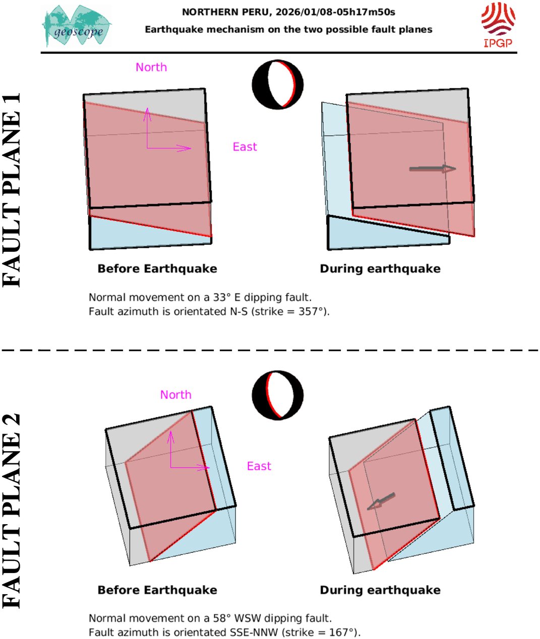 This figure illustrates how the two blocks separated by the seismic fault are displaced during the earthquake. These movements are deduced from the SCARDEC focal mechanism, on the two possible fault planes. Additional information (tectonics, near-fault measurements) is required to determine which one of these two hypotheses corresponds to the real movements during the earthquake.
