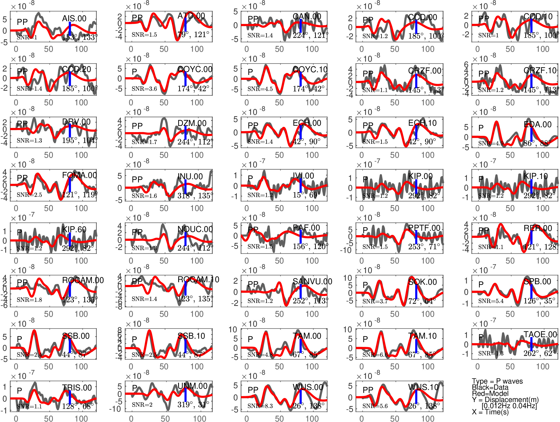 Figure 1: Agreement between data (black) and synthetics (red) for P or PP waves (the type of waves used is indicated in each subfigure). The comparison is shown with a time shift (noted 'Dt1' in Table 1), corresponding to the optimal fit ('Fit1' in Table 1) before the blue tick. Also indicated are the azimuth and distance of the station, and the signal to noise ratio (SNR). Note that the prediction done for PP waves is expected to be less accurate than the one for P waves.