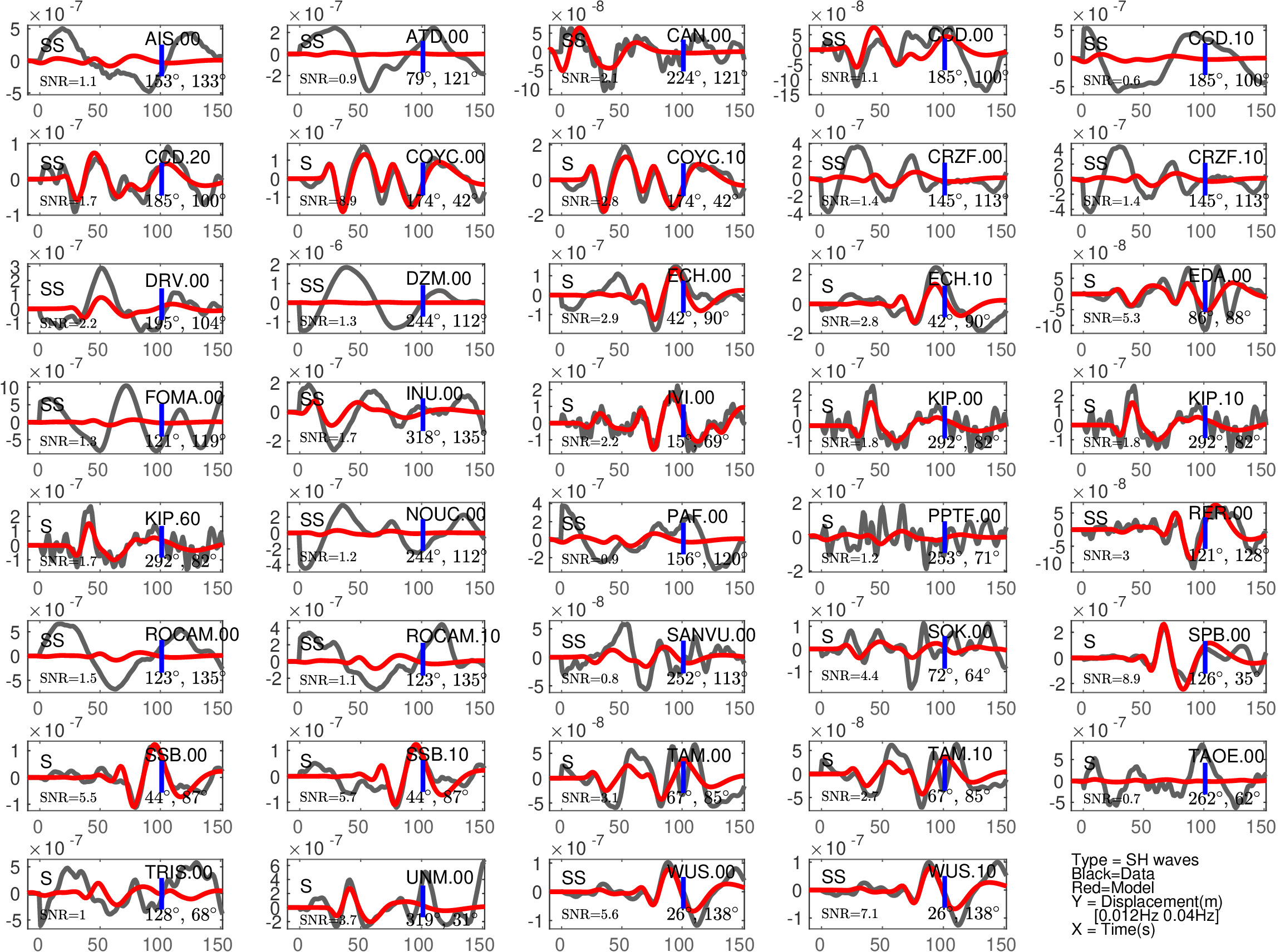The SCARDEC solution is used here to predict the waveforms at all Geoscope stations received in real time and located at distances between 30° and 150° from the earthquake. All available location codes are used, for the BH* channels. In the range [30° - ~90°], the prediction is done on P and S(H) waves and in the range [~90° - 150°], it is done on PP and SS(H) waves. See agreement for P or PP waves (vertical components) between data and synthetics in Figure 1; see agreement for S(H) or SS(H) waves (horizontal components) between data (black) and synthetics (red) in Figure 2. Tables 1 and 2 provide quantitative estimates of these agreements.