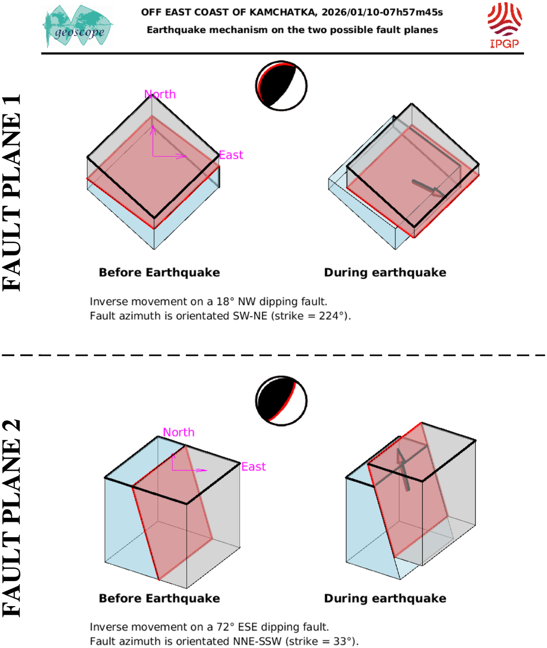 This figure illustrates how the two blocks separated by the seismic fault are displaced during the earthquake. These movements are deduced from the SCARDEC focal mechanism, on the two possible fault planes. Additional information (tectonics, near-fault measurements) is required to determine which one of these two hypotheses corresponds to the real movements during the earthquake.