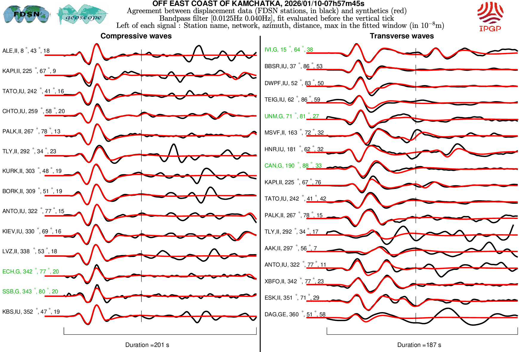The SCARDEC solution is used here to predict the waveforms at all Geoscope stations received in real time and located at distances between 30° and 150° from the earthquake. All available location codes are used, for the BH* channels. In the range [30° - ~90°], the prediction is done on P and S(H) waves and in the range [~90° - 150°], it is done on PP and SS(H) waves. See agreement for P or PP waves (vertical components) between data and synthetics in Figure 1; see agreement for S(H) or SS(H) waves (horizontal components) between data (black) and synthetics (red) in Figure 2. Tables 1 and 2 provide quantitative estimates of these agreements.